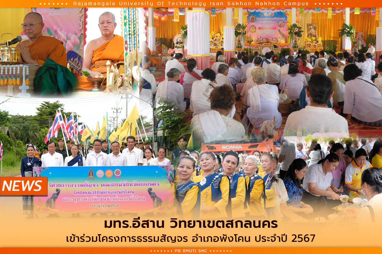 16 สิงหาคม 2567 มทร.อีสาน วิทยาเขตสกลนคร นำโดย ผศ.น.สพ.ดร.ชเวง สารคล่อง รองอธิการบดีประจำวิทยาเขตสกลนคร พร้อมด้วยคณะผู้บริหาร คณาจารย์ บุคลากร มทร.อีสาน วิทยาเขตสกลนคร เข้าร่วมโครงการธรรมสัญจร อำเภอพังโคน ประจำปี 2567 ได้รับเกียรติจาก นายสมเจตน์ พิมพานนท์ นายอำเภอพังโคน เป็นประธานในพิธี โดยทาง มทร.อีสาน วิทยาเขตสกลนคร ได้ร่วมกับชุมชน และส่วนราชการของหน่วยงานอำเภอพังโคนร่วมแรงรวมใจจัดเตรียมสถานที่ และในวันงานได้เข้าร่วมงานพร้อมยังได้เป็นเจ้าภาพโรงทานในงานครั้งนี้อีกด้วย