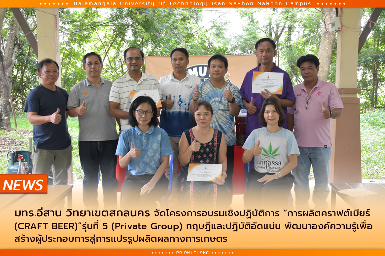 มทร.อีสาน วิทยาเขตสกลนคร จัดโครงการอบรมเชิงปฏิบัติการ “การผลิตคราฟต์เบียร์ (Craft Beer)”รุ่นที่ 5 โดยการอบรมในครั้งนี้ มุ่งหวังให้ผู้เข้าร่วมอบรมสามารถพัฒนาต่อยอดองค์ความรู้เพื่อสร้างผู้ประกอบการสู่การแปรรูปผลิตผลทางการเกษตรเป็นคราฟเบียร์ เพิ่มมูลค่า เพิ่มอัตลักษณ์ให้สินค้าเกษตรท้องถิ่นได้เป็นอย่างดี ซึ่งมีกำหนดจัดงานในระหว่างวันที่ 16-17 สิงหาคม 2567 ณ ห้องประชุมค้ำคูณ 2 อาคารวิจัยและพัฒนา มทร.อีสาน วิทยาเขตสกลนคร ได้รับเกียรติจาก ผศ.ดร.นำพน พิพัฒน์ไพบูลย์ ผู้ช่วยอธิการบดี และอาจารย์สยาม ประจุดทะศรี อาจารย์ประจำสาขาวิศวกรรมไฟฟ้า คณะอุตสาหกรรมและเทคโนโลยี ผศ.ดร.ศุกฤชชญา เหมะธุลิน อาจารย์คณะทรัพยากรธรรมชาติ เป็นวิทยากรอบรมให้ความรู้ในครั้งนี้ โดยเนื้อหาการฝึกอบรมมีหัวข้อให้ความรู้มากมาย อาทิ หลักการคราฟเบียร์ วัตถุดิบที่ต้องใช้ในการผลิตคราฟท์เบียร์ กฎหมายที่เกี่ยวข้อง การเตรียมเครื่องมือ อุปกรณ์ ในการผลิตเบียร์ การบรรจุเบียร์ การสร้างฟองเบียร์ด้วยกระบวนคาร์โบเนชั่น การคำนวณสูตรปริมาณส่วนผสมในการผลิตเบียร์เพื่อให้ได้แอลกอฮอล์ตามต้องการ และยังได้ทดลองฝึกปฏิบัติการต้มเบียร์ด้วยหม้อแก๊ส & หม้อไฟฟ้าอีกด้วย