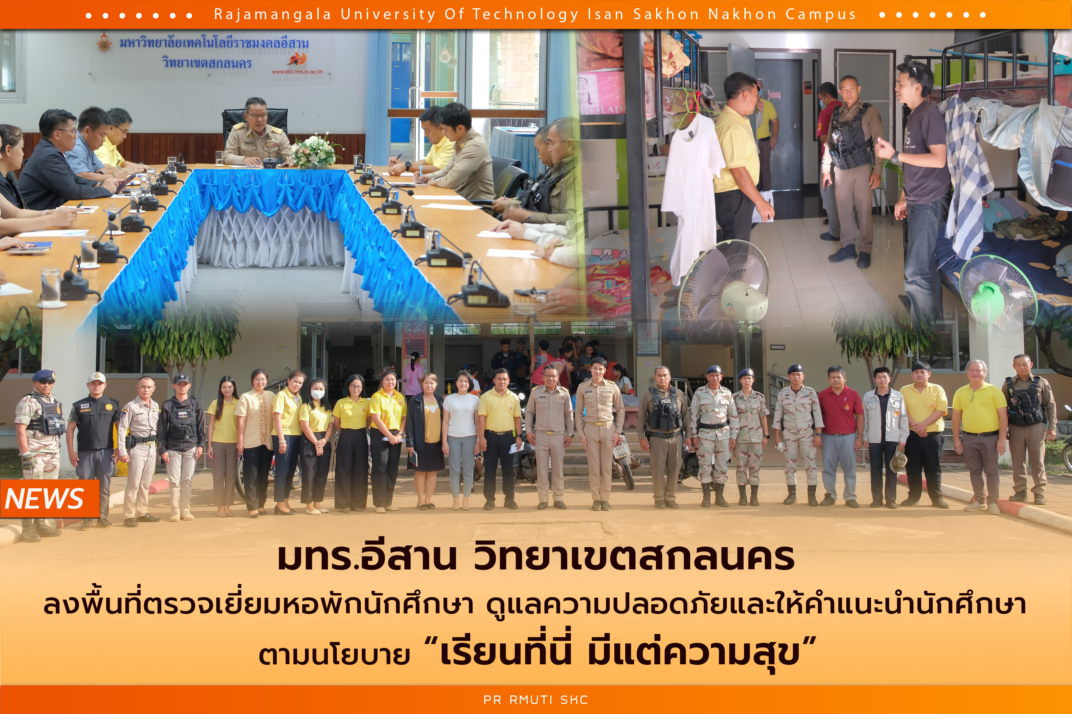 3 กันยายน 2567 มทร.อีสาน วิทยาเขตสกลนคร นำโดย ผศ.น.สพ.ดร.ชเวง สารคล่อง รองอธิการบดีประจำวิทยาเขตสกลนคร ปลัดอำเภอฝ่ายความมั่นคง/ร้อย อส.อำเภอพังโคน เจ้าหน้าที่ตำรวจ สภ.อำเภอพังโคน และคณะกรรมการตรวจเยี่ยมหอพักนักศึกษา ร่วมประชุมการให้คำแนะนำและความรู้สารเสพติดและสิ่งผิดกฎหมาย ในการออกตรวจเยี่ยมหอพักนักศึกษา มทร.อีสาน วิทยาเขตสกลนคร การตรวจเยี่ยมในครั้งนี้มีวัตถุประสงค์เพื่อแนะนำให้ความรู้และป้องปรามสิ่งผิดกฎหมาย ให้หอพักสวัสดิการฯ มีความปลอดภัยตามมาตรฐานที่กำหนด ตามนโยบาย "เรียนที่นี่ มีแต่ความสุข" โดยได้เข้าตรวจเยี่ยมนักศึกษาที่พักหอในมหาวิทยาลัย จำนวนทั้งสิ้น 4 หอพัก ได้แก่ หอพักชายบัวหลวง หอพักชายบัวแดง หอพักหญิงบัวชมพู หอพักหญิงบัวน้ำเงิน