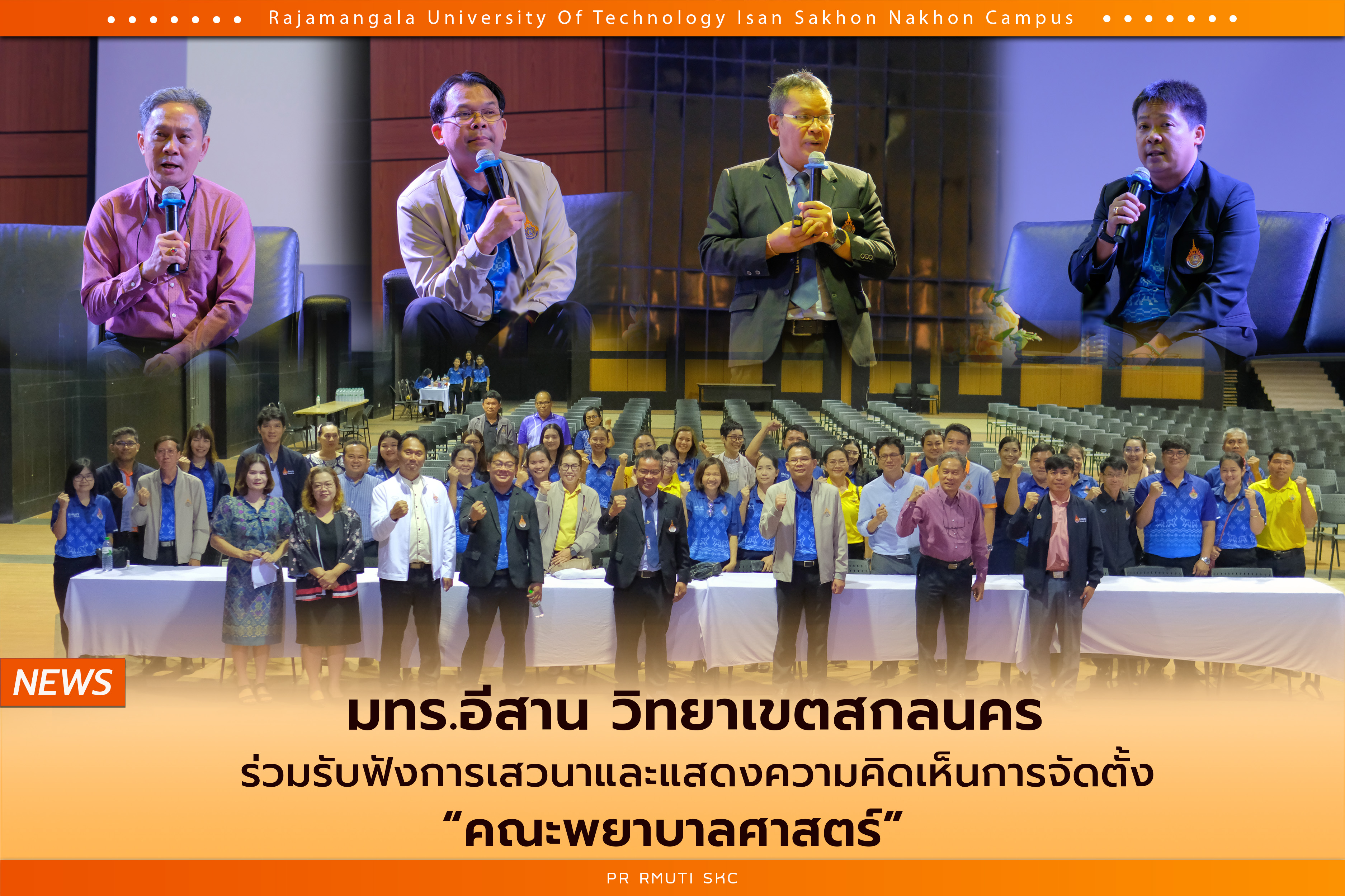 วันที่ 18 กันยายน 2567 นำโดย ผศ.น.สพ.ดร.ชเวง สารคล่อง รองอธิการบดีประจำวิทยาเขตสกลนคร พร้อมด้วยคณะผู้บริหาร ได้แก่ ผศ.ดร.นำพน พิพัฒน์ไพบูลย์ ผู้ช่วยอธิการบดี , ผศ. ดร.พิเชษฐ เวชวิฐาน คณบดีคณะทรัพยากรธรรมชาติ และผศ. ดร.สุริยา แก้วอาษา คณบดีคณะอุตสาหกรรมและเทคโนโลยี ในการเสวนาการจัดตั้งคณะพยาบาลศาสตร์ การเสวนาในครั้งนี้จัดขึ้นเพื่อแลกเปลี่ยนความคิดเห็นและข้อมูลร่วมกับบุคลากรภายในมหาวิทยาลัย โดยมีวัตถุประสงค์หลักในการสร้างความเข้าใจเกี่ยวกับการบริหารจัดการคณะพยาบาลศาสตร์ที่จะจัดตั้งขึ้น เพื่อพัฒนาบัณฑิตพยาบาลที่มีความรู้ความเชี่ยวชาญด้านการพยาบาลและวิทยาศาสตร์สุขภาพอย่างมีศักยภาพ บูรณาการองค์ความรู้ในการประกอบวิชาชีพพยาบาล สอดคล้องกับความต้องการของสังคมและภาคการแพทย์ในอนาคต นับเป็นก้าวสำคัญในการเตรียมการจัดตั้งคณะพยาบาลศาสตร์ ที่จะช่วยเพิ่มศักยภาพของมหาวิทยาลัยและยกระดับคุณภาพการศึกษาในระดับอุดมศึกษาด้านวิทยาศาสตร์สุขภาพให้กับวิทยาเขตสกลนครต่อไป ณ ห้องประชุมราชมงคล อาคารเรียนรวม มหาวิทยาลัยเทคโนโลยีราชมงคลอีสาน วิทยาเขตสกลนคร