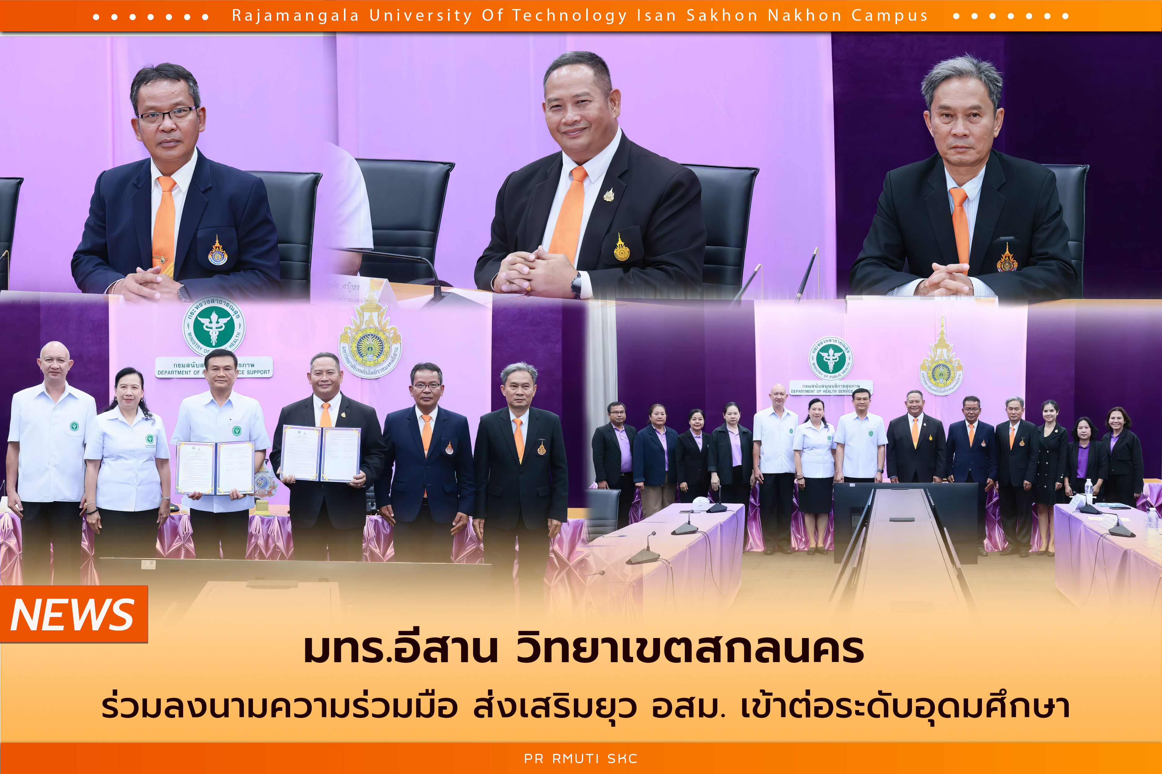 วันที่ 25 กันยายน 2567 มหาวิทยาลัยเทคโนโลยีราชมงคลอีสาน นําโดย รศ.ดร.โฆษิต ศรีภูธร อธิการบดีมหาวิทยาลัยเทคโนโลยีราชมงคลอีสาน พร้อมด้วย ผศ.น.สพ.ดร.ชเวง สารคล่อง รองอธิการบดีประจําวิทยาเขตสกลนคร และ ผศ.ดร.พิเชษฐ เวชวิฐาน คณบดีคณะทรัพยากรธรรมชาติ ได้ร่วมลงนามในบันทึกความร่วมมือกับกรมสนับสนุนบริการสุขภาพ เพื่อการส่งเสริมและพัฒนายุวอาสาสมัครสาธารณสุข ยุว อสม. ความร่วมมือในครั้งนี้มุ่งเน้นการสนับสนุนด้านการศึกษาและการสร้างแรงจูงใจให้แก่ ยุว อสม. โดยเน้นการเข้าศึกษาต่อในคณะทรัพยากรธรรมชาติ เพื่อเป็นส่วนหนึ่งในการพัฒนาบุคลากรให้กับภาคการสาธารณสุขและตลาดสุขภาพของประเทศ โดยมี นพ.สุระ วิเศษศักดิ์ อธิบดีกรมสนับสนุนบริการสุขภาพ และคณะ ร่วมลงนามในครั้งนี้ ณ ห้องประชุมสุขศึกษา อาคารกรมสนับสนุนบริการสุขภาพ (กรม สบส.)