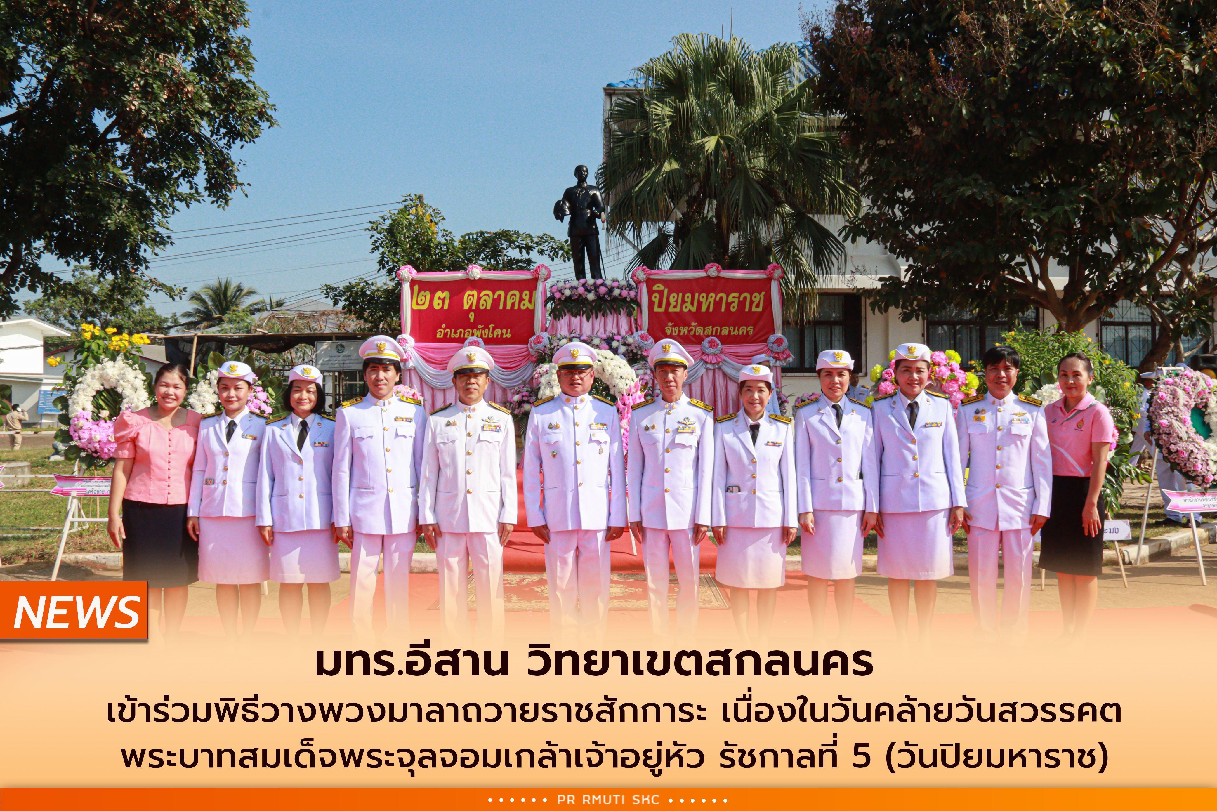 วันที่ 23 ตุลาคม 2567 ผู้บริหาร คณาจารย์ และเจ้าหน้าที่ มทร.อีสาน วิทยาเขตสกลนคร นำโดย ผศ.อัมพร ภูศรีฐาน ผู้ช่วยอธิการบดี ร่วมพิธีวางพวงมาลาถวายราชสักการะ พระบรมราชานุสาวรีย์ พระบาทสมเด็จพระจุลจอมเกล้าเจ้าอยู่หัว รัชกาลที่ 5 เนื่องในวันปิยมหาราช เพื่อเป็นการรำลึกถึงพระมหากรุณาธิคุณของพระองค์ท่านที่มีต่อพสกนิกรชาวไทย โดยมีหัวหน้าส่วนราชการ ข้าราชการ ผู้นำชุมชน ผู้นำท้องถิ่น เข้าร่วมพิธีเป็นจำนวนมาก ณ ลานหน้าที่ว่าการอำเภอพังโคน จังหวัดสกลนคร