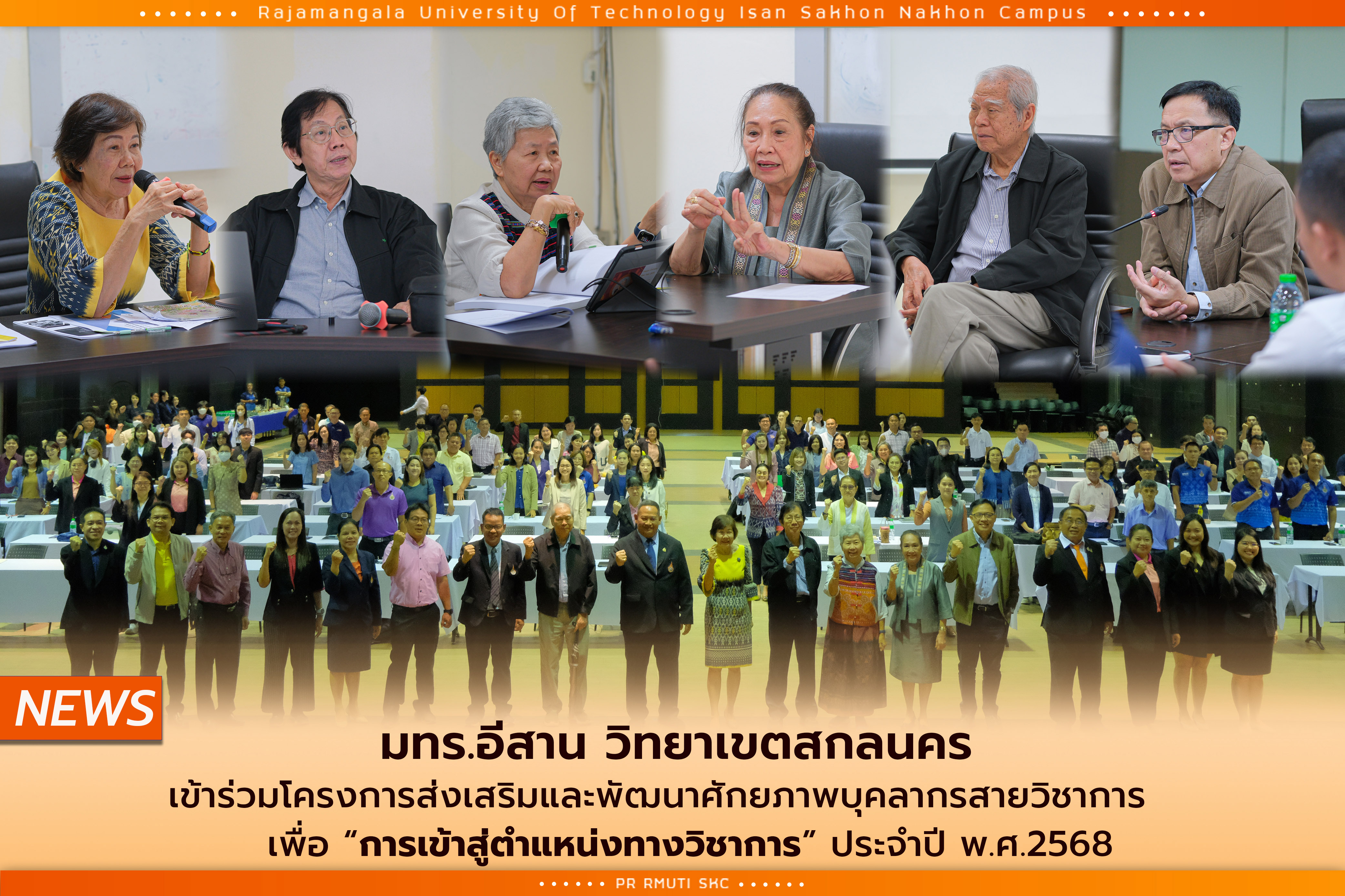 วันที่ 23 ตุลาคม 2567 รองศาสตราจารย์ ดร.โฆษิต ศรีภูธร อธิการบดีมหาวิทยาลัยเทคโนโลยีราชมงคลอีสาน พร้อมด้วยผู้บริหารระดับสูงได้แก่ ผศ.น.สพ.ดร.ชเวง สารคล่อง รองอธิการบดีประจำวิทยาเขตสกลนคร และรองศาสตราจารย์ ดร.สำเนาว์ เสาวกูล รองอธิการบดีประจำวิทยาเขตสุรินทร์ ตลอดจนคณะผู้บริหารและคณาจารย์จากวิทยาเขตต่างๆ ได้แก่ นครราชสีมา สกลนคร สุรินทร์ และขอนแก่น ได้ร่วมกันให้การต้อนรับคณะกรรมการพิจารณาตำแหน่งทางวิชาการ ของข้าราชการพลเรือนในสถาบันอุดมศึกษา และพนักงานในสถาบันอุดมศึกษาทั้ง 6 ท่าน ได้แก่ 1.ศาสตราจารย์ ดร.สมชาย วงศ์วิเศษ 2.ศาสตราจารย์ ดร.วัลลภ สุระกำพลธร 3.ศาสตราจารย์กิตติคุณ เดชา บุญค้ำ 4.ศาสตราจารย์กิตติคุณ ดร.อัจฉรา จันทร์ฉาย 5.ศาสตราจารย์ ดร.ละออศรี เสนาะเมือง 6.ศาสตราจารย์กิตติคุณ ดร.ธีรพันธ์ เหลืองทองคำ โดยได้รับเกียรติจากทั้ง 6 ท่านเป็นวิทยากรผู้ทรงคุณวุฒิในโครงการส่งเสริมและพัฒนาศักยภาพบุคลากรสายวิชาการ เพื่อ "การเข้าสู่ตำแหน่งทางวิชาการ" ประจำปี พ.ศ. 2568 จัดขึ้นระหว่างวันที่ 23-24 ตุลาคม 2567 ณ ห้องประชุมราชมงคล อาคารเรียนรวม มทร.อีสาน วิทยาเขตสกลนคร การจัดโครงการในครั้งนี้มีวัตถุประสงค์ในการแลกเปลี่ยนความรู้ และให้คำแนะนำเกี่ยวกับการพัฒนาตำแหน่งทางวิชาการของข้าราชการพลเรือนและพนักงานในสถาบันอุดมศึกษา โครงการนี้สะท้อนถึงความมุ่งมั่นของ มทร.อีสาน ในการส่งเสริมคุณภาพการศึกษาและสนับสนุนการพัฒนาทางวิชาการ เพื่อสร้างความเข้มแข็งในด้านการบริหารงานบุคคลและวิชาการในระดับอุดมศึกษาอย่างยั่งยืน