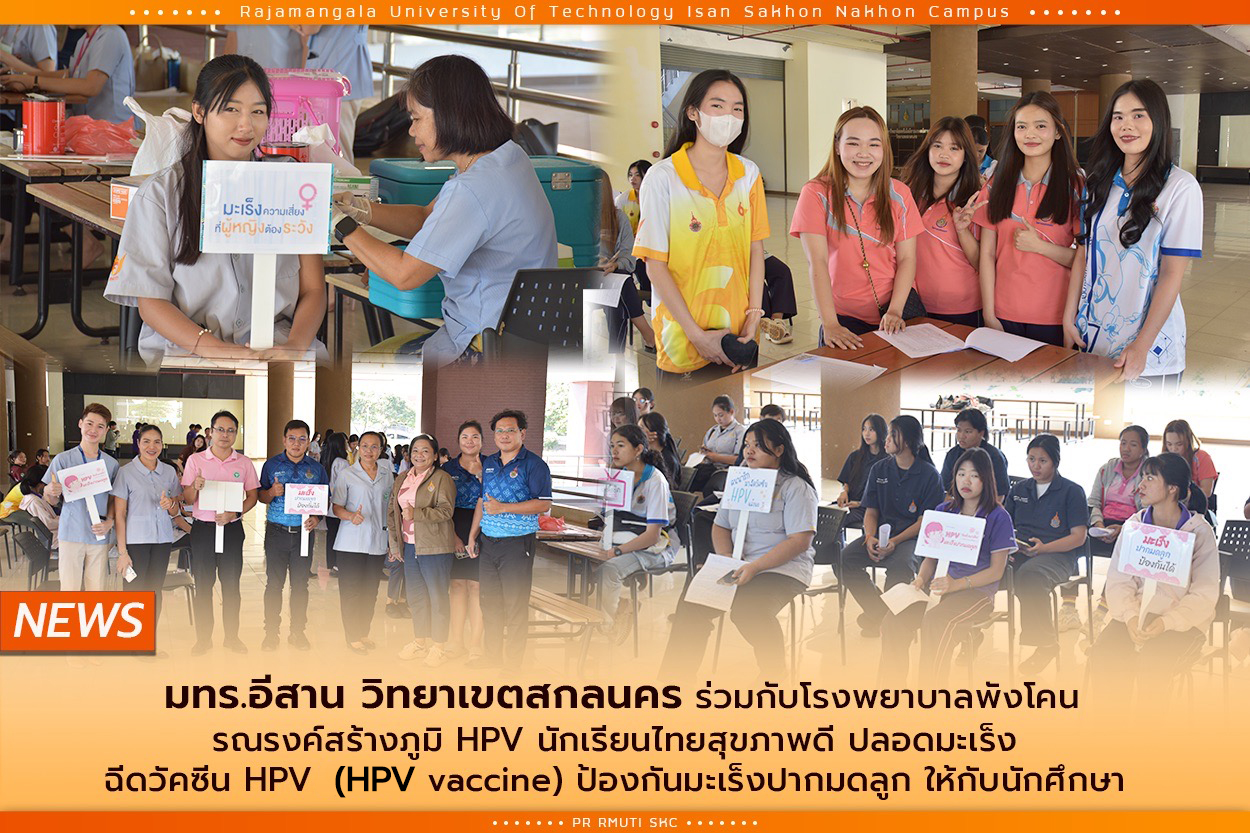 วันที่ 13 พฤศจิกายน 2567 มทร.อีสาน วิทยาเขตสกลนคร นำโดย ผศ.น.สพ.ดร.ชเวง สารคล่อง รองอธิการบดีประจำวิทยาเขตสกลนคร ร่วมกับโรงพยาบาลพังโคน ขานรับนโยบายมะเร็ง ครบวงจรของ สธ. กิจกรรม KICK OFF การรณรงค์สร้างภูมิ HPV นักเรียนไทยสุขภาพดีปลอดมะเร็ง ฉีดวัคซีน HPV (HPV VACCINE) วัคซีนป้องกันมะเร็งปากมดลูกให้กับนักศึกษา ณ อาคารเรียนรวม(อาคาร12)