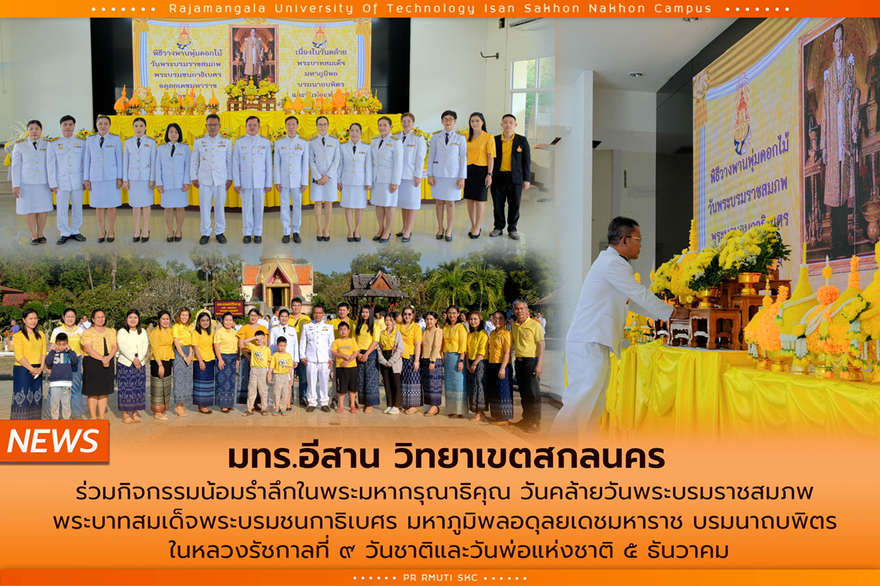 วันที่ 5 ธันวาคม 2567 คณะผู้บริหาร คณาจารย์ บุคลากร มทร.อีสาน วิทยาเขตสกลนคร นำโดย ผศ.น.สพ.ดร.ชเวง สารคล่อง รองอธิการบดีประจำวิทยาเขตสกลนคร ร่วมกิจกรรมน้อมรำลึกฯ ในพระมหากรุณาธิคุณเนื่องในวันคล้ายวันพระบรมราชสมภพ พระบาทสมเด็จพระบรมชนกาธิเบศร มหาภูมิพลอดุลยเดชมหาราช บรมนาถบพิตร 5 ธันวาคม โดยได้มีพิธีเจริญพระพุทธมนต์และทำบุญตักบาตรถวายพระราชกุศล ณ วัดศรีจำปาชนบท และพิธีวางพานพุ่มดอกไม้ถวายราชสักการะ เพื่อน้อมรำลึกในพระมหากรุณาธิคุณฯ ณ หอประชุมที่ว่าการอำเภอพังโคน จังหวัดสกลนคร