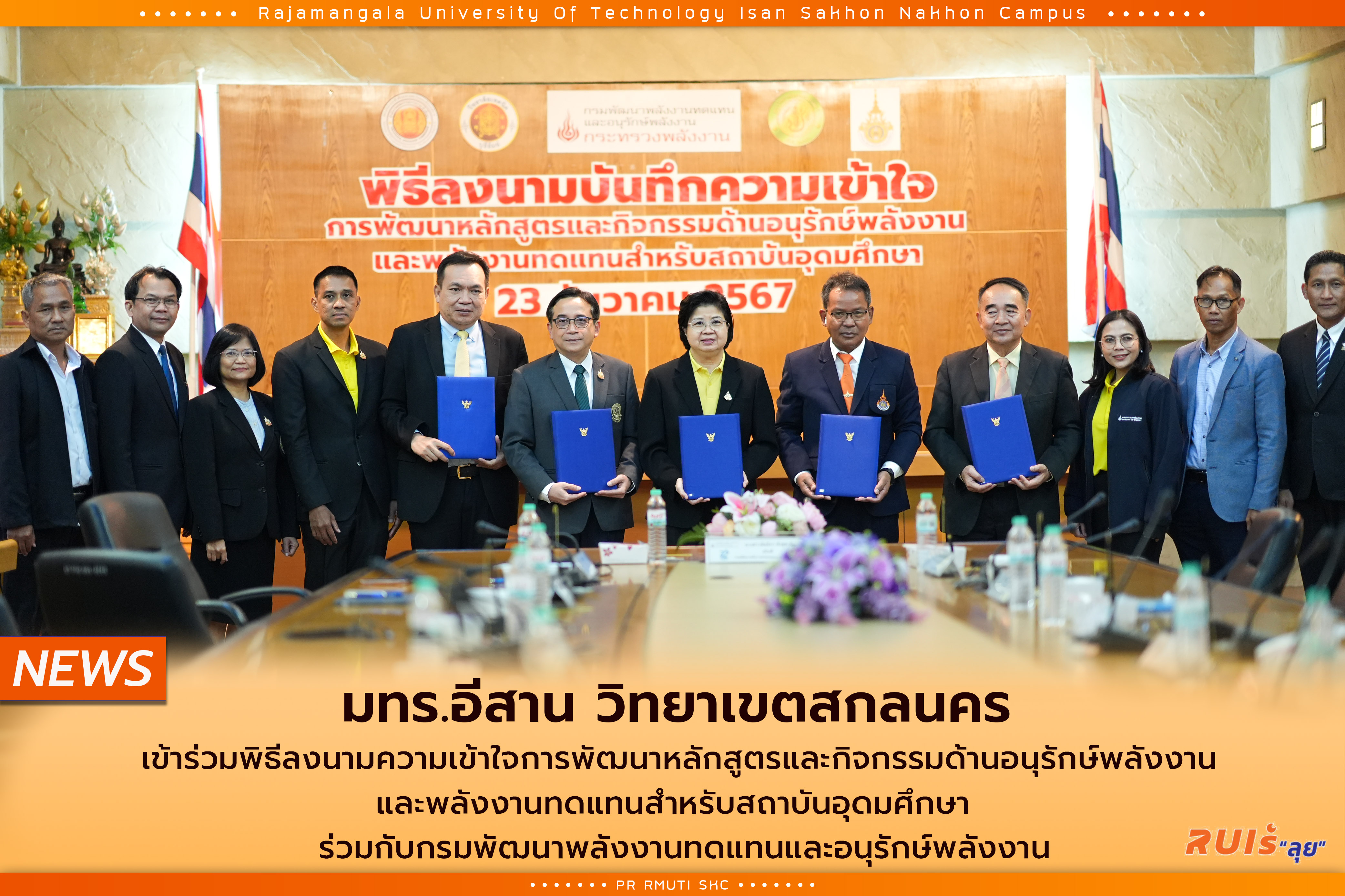 23 ธันวาคม 2567 มทร.อีสาน วิทยาเขตสกลนคร นำโดย ผศ. น.สพ. ดร.ชเวง สารคล่อง รองอธิการบดีประจำวิทยาเขตสกลนคร พร้อมด้วย ผศ. ดร.สุริยา แก้วอาษา คณบดีคณะอุตสาหกรรมและเทคโนโลยี ผศ. ดร.พรเทพ ปัญญาแก้ว รองคณบดีฝ่ายวิชาการและวิจัย เข้าร่วม "พิธีลงนามความเข้าใจการพัฒนาหลักสูตรและกิจกรรมด้านอนุรักษ์พลังงานและพลังงานทดแทนสำหรับสถาบันอุดมศึกษา" ร่วมกับกรมพัฒนาพลังงานทดแทนและอนุรักษ์พลังงาน โดยมีนางสาวนันธิกา ทังสุพานิช อธิบดีกรมพัฒนาพลังงานทดแทนและอนุรักษ์พลังงาน ณ กรมพัฒนาพลังงานทดแทนและอนุรักษ์พลังงาน กรุงเทพฯ เพื่อให้นักศึกษาในหลักสูตรวิศวกรรมศาสตรบัณฑิต (วศ.บ.) สาขาวิชาวิศวกรรมเครื่องกล สามารถเข้ารับการทดสอบเพื่อรับวุฒิบัตรเป็นผู้รับชอบด้านพลังงานสามัญอาคารและโรงงาน การลงนามในครั้งนี้เป็นก้าวสำคัญในการสนับสนุนการพัฒนาอาชีพของนักศึกษา และเสริมสร้างความร่วมมือในด้านการอนุรักษ์พลังงานและการใช้พลังงานทดแทนในระดับประเทศ โดยการทำงานร่วมกันระหว่างสถาบันอุดมศึกษาและหน่วยงานภาครัฐ ในการเสริมสร้างทักษะและความรู้ให้กับเยาวชนรุ่นใหม่ ที่มีศักยภาพในการขับเคลื่อนการพัฒนาที่ยั่งยืนต่อไปในอนาคต