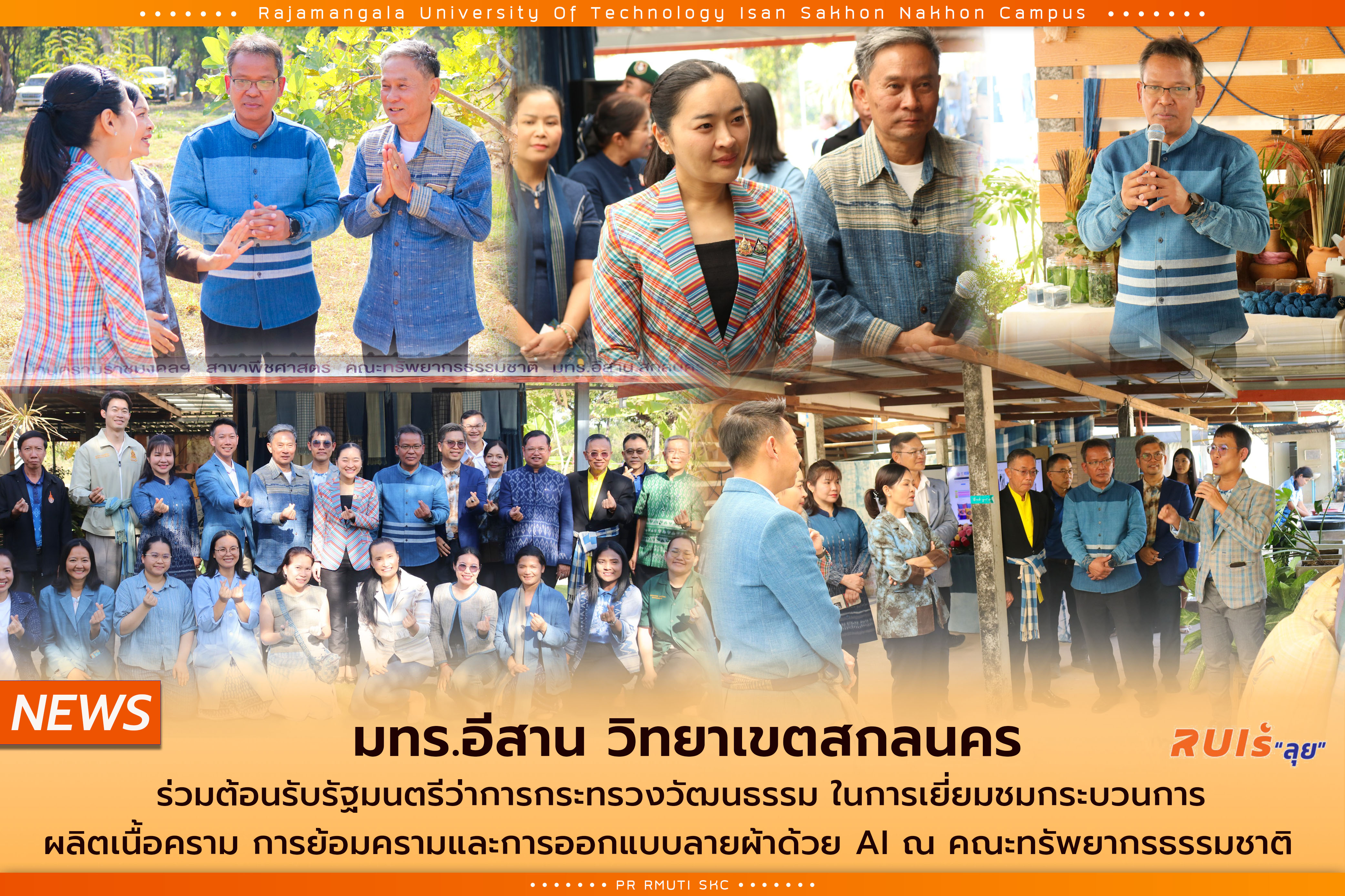วันที่ 25 ธันวาคม 2567 มทร.อีสาน วิทยาเขตสกลนคร นำโดย ผศ.น.สพ.ดร.ชเวง สารคล่อง รองอธิการบดีประจำวิทยาเขตสกลนคร และ ผศ.ดร.พิเชษฐ เวชวิฐาน คณบดีคณะทรัพยากรธรรมชาติ พร้อมด้วยคณะผู้บริหาร คณาจารย์ และเจ้าหน้าที่ ร่วมให้การต้อนรับ นางสาวสุดาวรรณ หวังศุภกิจโกศล รัฐมนตรีว่าการกระทรวงวัฒนธรรม ในโอกาสเดินทางมาเยี่ยมชมกลุ่มผ้าย้อมคราม พร้อมทั้งเยี่ยมชมกระบวนการผลิตเนื้อครามและการย้อมคราม การออกแบบลายผ้าด้วย AI ซึ่งเป็นการต่อยอดภูมิปัญญาท้องถิ่นที่มีศักยภาพ ในโอกาสนี้คณะนักวิจัย โดยมีอาจารย์ ดร.วาสนา แผลติตะ อาจารย์ประจำสาขาพืชศาสตร์ เป็นตัวแทนในการนำเสนอการควบคุมคุณภาพและมาตรฐานการผลิตครามและการย้อมคราม รวมถึงกระบวนการผลิตผลิตภัณฑ์ต่าง ๆ ที่เกี่ยวข้อง นอกจากนี้ คณะนักวิจัยและคณาจารย์ยังได้ร่วมจัดแสดงผลิตภัณฑ์จากคณะทรัพยากรธรรมชาติ รวมไปถึงผลิตภัณฑ์สมุนไพรที่ผลิตจากโรงผลิตของ มทร.อีสาน วิทยาเขตสกลนคร อีกด้วย การเยี่ยมชมครั้งนี้สะท้อนถึงการสนับสนุนจากกระทรวงวัฒนธรรมในการส่งเสริมการอนุรักษ์ พัฒนาผลิตภัณฑ์ ส่งเสริมการเรียนรู้ และการวิจัยด้านการพัฒนาผลิตภัณฑ์และสมุนไพร ณ คณะทรัพยากรธรรมชาติ มทร.อีสาน วิทยาเขตสกลนคร