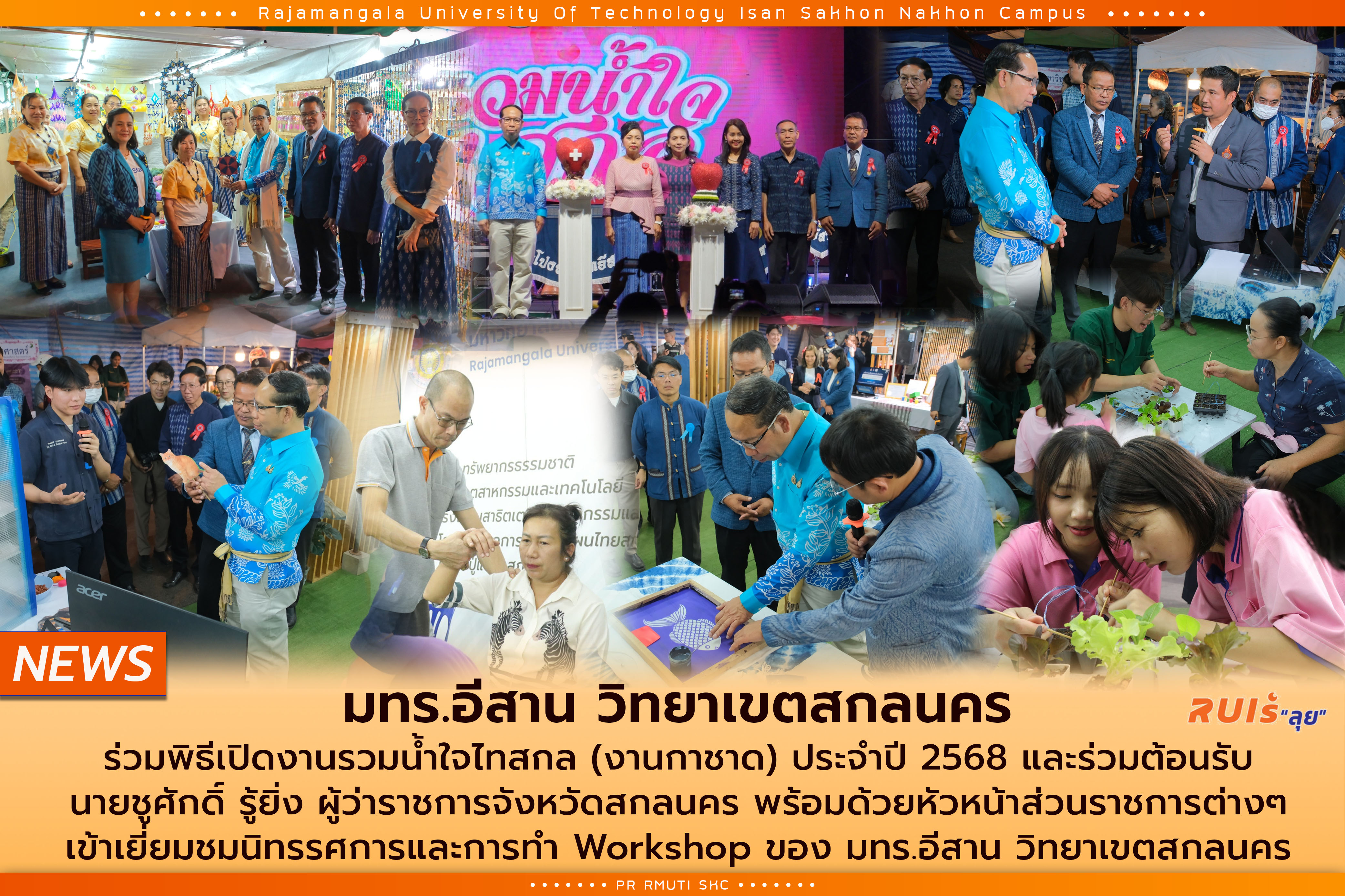 วันที่ 24 มกราคม 2568 ผู้บริหาร คณาจารย์ เจ้าหน้าที่ และนักศึกษา มทร.อีสาน วิทยาเขตสกลนคร นำโดย ผศ.น.สพ.ดร.ชเวง สารคล่อง รองอธิการบดีประจำวิทยาเขตสกลนคร ร่วมพิธีเปิดงานรวมน้ำใจไทสกล (งานกาชาด) ประจำปี 2568 และร่วมต้อนรับ นายชูศักดิ์ รู้ยิ่ง ผู้ว่าราชการจังหวัดสกลนคร พร้อมด้วยหัวหน้าส่วนราชการต่างๆ เข้าเยี่ยมชมนิทรรศการของมทร.อีสาน วิทยาเขตสกลนคร ณ ลานหน้าศาลากลางจังหวัดสกลนคร (หลังเก่า) โดยในปีนี้ทาง มทร.อีสาน วิทยาเขตสกลนคร ได้เข้าร่วมจัดนิทรรศการและมีกิจกรรมเวิร์คช็อปช่วงเย็น รวมถึงการแสดงผลงานวิจัยต่างๆของคณะทรัพยากรธรรมชาติ คณะอุตสาหกรรมและเทคโนโลยี คลินิกเทคโนโลยี การให้บริการหัตถการจากบุคลากรโรงพยาบาลการแพทย์แผนไทยสกลนคร หลวงปู่แฟ๊บ สุภัทโท และยังมีกิจกรรมที่หลากหลายให้ผู้เที่ยวชมได้ร่วมกิจกรรม อาทิ workshop จากคณะอุตสาหกรรมและเทคโนโลยี ได้แก่ การทำโคมไฟประยุกต์จากธุงอีสาน, เครื่องให้อาหารแมวอัจฉริยะ ,การทำพวงกุญแจดาวกระจาย, การจัดโต๊ะอาหารแบบสากลและพับผ้าเช็ดปากรูปแบบต่างๆ และ workshop จากคณะทรัพยากรธรรมชาติ ได้แก่ การผลิตผัก, คลอเรลล่า 3F(Food for fish) สแน๊คสุนัขอารมณ์ดี, สครับผิวออร่า, คุ๊กกี้ไส้หม่อน ชาใบหม่อน โดยได้ร่วมจัดกิจกรรมภายในงานตลอด 10 วัน ซึ่งมีกำหนดจัดขึ้นในระหว่างวันที่ 24 มกราคม - 2 กุมภาพันธ์ 2568 ณ เส้นศูนย์ราชการ ศาลากลาง จังหวัดสกลนคร