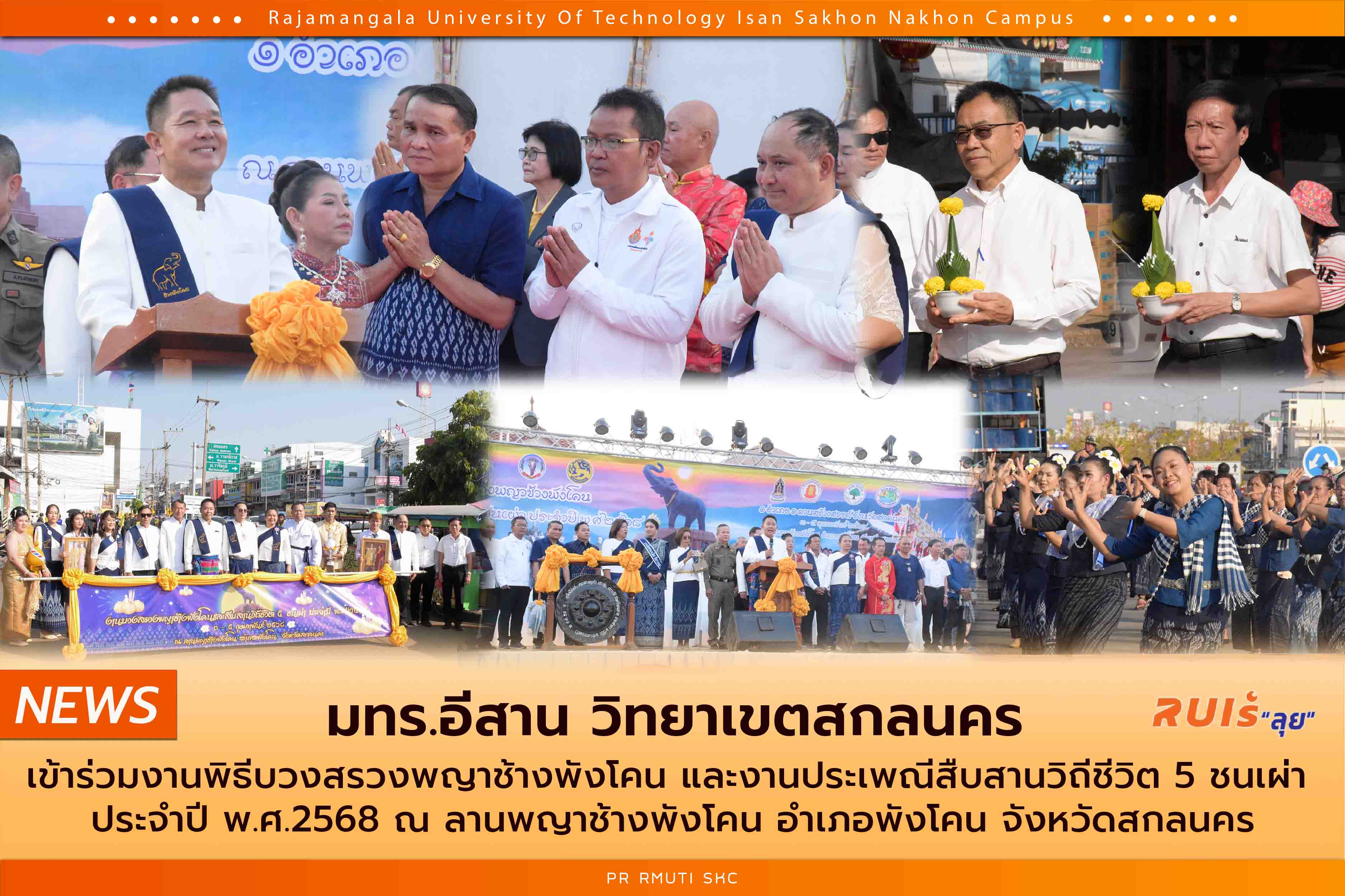 มทร.อีสาน วิทยาเขตสกลนคร นำโดย ผศ.น.สพ.ดร.ชเวง สารคล่อง รองอธิการบดีประจำวิทยาเขตสกลนคร พร้อมด้วยคณะผู้บริหาร ร่วมกับอำเภอพังโคน หัวหน้าส่วนราชการ สถานศึกษา หัวหน้าหน่วยงานรัฐวิสาหกิจ องค์กรปกครองส่วนท้องถิ่น กำนัน ผู้ใหญ่บ้าน ฯลฯ เข้าร่วมเดินขบวนเครื่องบวงสรวงพญาช้างพังโคน และขบวนวิถีชีวิต 5 ชนเผ่า ภายใต้งานพิธีบวงสรวงพญาช้างพังโคน และงานประเพณีสืบสานวิถีชีวิต 5 ชนเผ่า ประจำปี พ.ศ. 2568 ซึ่งมีกำหนดจัดงานระหว่างวันที่ 3-5 กุมภาพันธ์ 2568 ณ ลานพญาช้างพังโคน อำเภอพังโคน จังหวัดสกลนคร