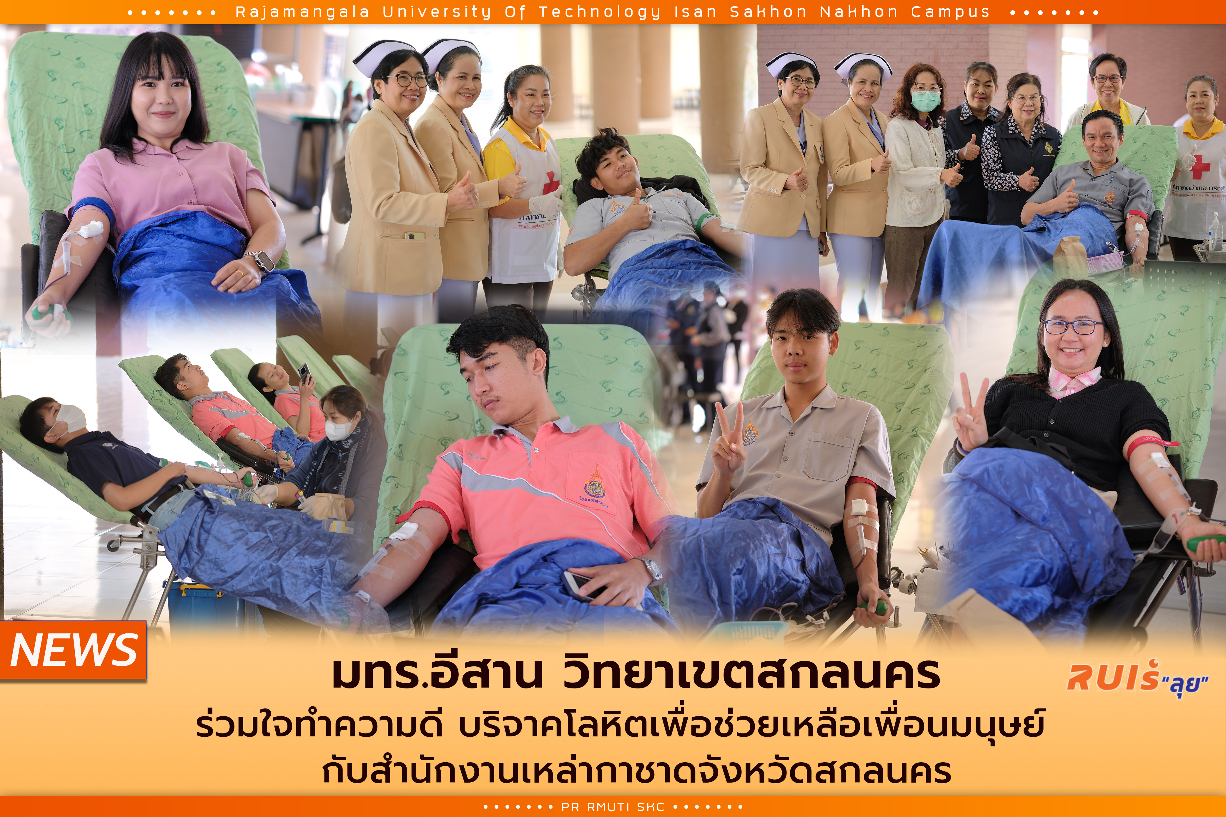 4 กุมภาพันธ์ 2568 มทร.อีสาน วิทยาเขตสกลนคร นำโดย ผศ.น.สพ.ดร.ชเวง สารคล่อง รองอธิการบดีประจำวิทยาเขตสกลนคร พร้อมด้วยคณะผู้บริหาร คณาจารย์ บุคลากร และนักศึกษา ร่วมใจทำความดี บริจาคโลหิตเพื่อช่วยเหลือเพื่อนมนุษย์กับสำนักงานเหล่ากาชาดจังหวัดสกลนคร ณ อาคารเรียนรวม (อาคาร12) ชั้น 1 การจัดกิจกรรมในครั้งนี้เป็นการแสดงความเสียสละเพื่อสังคมส่วนรวม โดยการบริจาคโลหิตถือเป็นการให้ที่ยิ่งใหญ่ ที่สามารถช่วยต่อชีวิตให้กับผู้ป่วยที่ต้องการโลหิตในการรักษา ซึ่งการบริจาคเลือด 1 ครั้งสามารถช่วยต่อชีวิตให้กับผู้ป่วยได้ถึง 3 คน การบริจาคโลหิตในครั้งนี้ถือเป็นการร่วมมือกันอย่างดีระหว่างมหาวิทยาลัยและเหล่ากาชาดจังหวัดสกลนคร เพื่อให้เกิดประโยชน์สูงสุดในการช่วยเหลือผู้ที่ต้องการโลหิตอย่างเร่งด่วนในช่วงเวลาสำคัญ