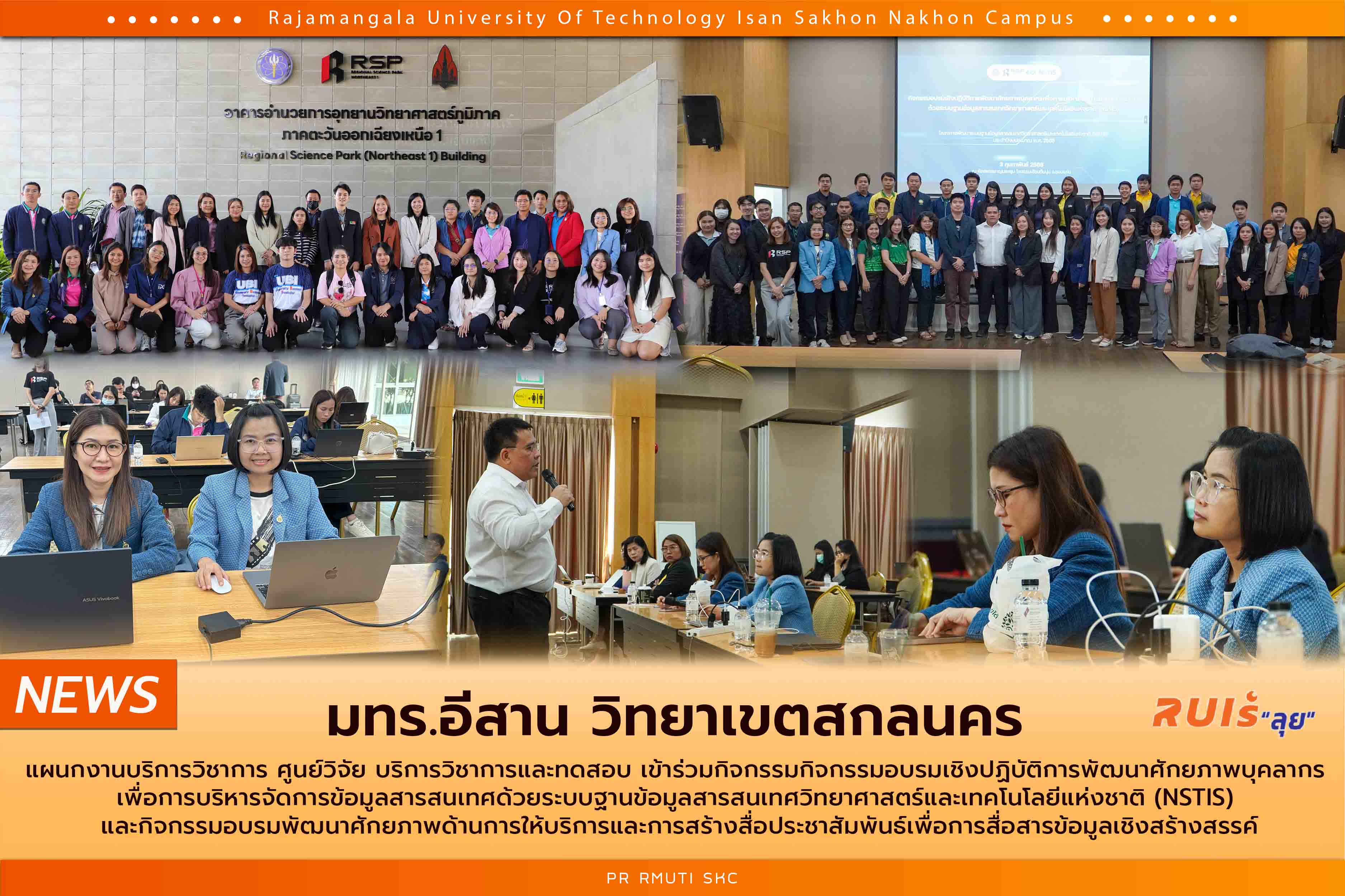 แผนกงานบริการวิชาการ ศูนย์วิจัย บริการวิชาการและทดสอบ เข้าร่วมกิจกรรมกิจกรรมอบรมเชิงปฏิบัติการพัฒนาศักยภาพบุคลากรเพื่อการบริหารจัดการข้อมูลสารสนเทศด้วยระบบฐานข้อมูลสารสนเทศวิทยาศาสตร์และเทคโนโลยีแห่งชาติ (NSTIS) และกิจกรรมอบรมพัฒนาศักยภาพด้านการให้บริการและการสร้างสื่อประชาสัมพันธ์เพื่อการสื่อสารข้อมูลเชิงสร้างสรรค์ภายใต้โครงการพัฒนาระบบฐานข้อมูลสารสนเทศวิทยาศาสตร์และเทคโนโลยีแห่งชาติ (NSTIS) และโครงการส่งเสริมกิจการอุทยานวิทยาศาสตร์ (นิคมธุรกิจวิทยาศาสตร์ภูมิภาค) ประจำปีงบประมาณ พ.ศ. 2568 ในระหว่างวันที่ 3 – 4 กุมภาพันธ์ 2568 ณ โรงแรมเฮือนต้นนุ่น และอาคารอำนวยการอุทยานวิทยาศาสตร์ภูมิภาค ภาคตะวันออกเฉียงเหนือ จ.ขอนแก่น