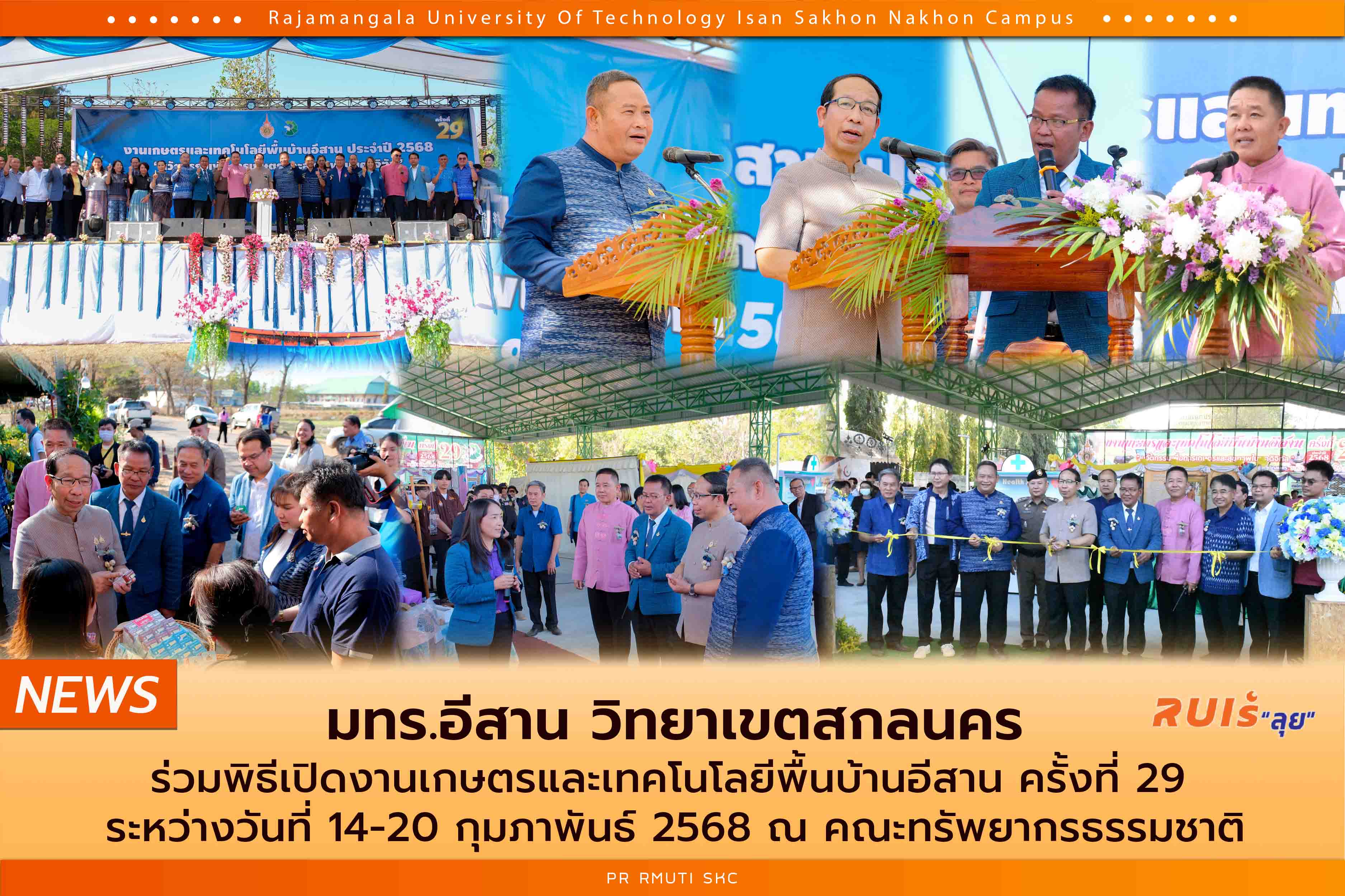 วันที่ 14 กุมภาพันธ์ 2568 มทร.อีสาน วิทยาเขตสกลนคร นำโดย รศ.ดร. โฆษิต ศรีภูธร อธิการบดีมหาวิทยาลัยเทคโนโลยีราชมงคลอีสาน พร้อมด้วย คณะผู้บริหาร มทร.อีสาน คณาจารย์ บุคลากรทางการศึกษา และนักศึกษา ร่วมพิธีเปิดงานเกษตรและเทคโนโลยีพื้นบ้านอีสาน ครั้งที่ 29 ระหว่างวันที่ 14-20 กุมภาพันธ์ 2568 วัตถุประสงค์เพื่อรณรงค์ ส่งเสริม เชิญชวน ให้เยาวชนและประชาชนทั่วไป ได้มีความรู้ความเข้าใจ และได้มีการน้อมนำพระราชดำริ หลักปรัชญาเศรษฐกิจพอเพียง เพื่อปรับใช้ในการดำรงชีวิต และเห็นถึงความสำคัญของทรัพยากรธรรมชาติ พร้อมจัดเสวนาวิชาการ และงานประชุมสัมมนา ซึ่งได้รับเกียรติจาก นายชูศักด์ รู้ยิ่ง ผู้ว่าราชการจังหวัดสกลนคร เป็นประธานกล่าวเปิดงาน โดย นอกจากนี้ยังได้มีการเยี่ยมชมนิทรรศการนวัตกรรมของมหาวิทยาลัยฯ นิทรรศการเกี่ยวกับสมุนไพรไทย นิทรรศการเกี่ยวกับโครงการในพระราชดำริ และนิทรรศการจากหน่วยงานราชการองค์กรเครือข่ายต่างๆ ณ คณะทรัพยากรธรรมชาติ มทร.อีสาน วิทยาเขตสกลนคร