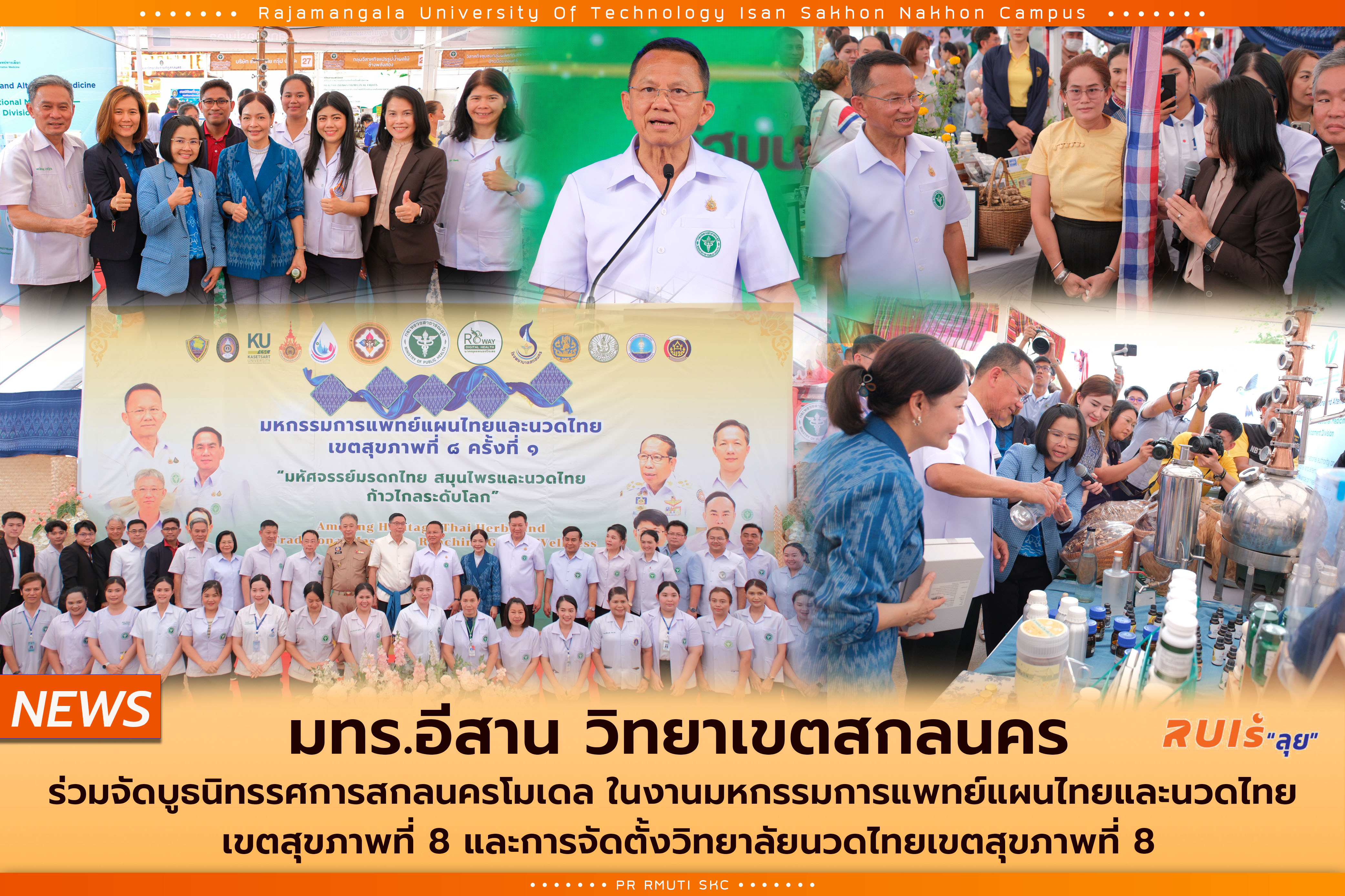 28 เมษายน 2568 มทร.อีสาน วิทยาเขตสกลนคร นำโดย ผศ.น.สพ.ดร.ชเวง สารคล่อง รองอธิการบดีประจำวิทยาเขตสกลนคร ได้มอบหมายให้คณะผู้บริหารและเจ้าหน้าที่จัดบูธนิทรรศการสกลนครโมเดล โดยมีผลิตภัณฑ์ที่ได้มาตรฐานจากอาคารปฏิบัติการเภสัชกรรมไทยมาตรฐาน GMP-PIC/s คณะทรัพยากรธรรมชาติ และผลิตภัณฑ์น้ำมันหอมระเหยจากสมุนไพรไทย ณ โรงพยาบาลสกลนคร จ.สกลนคร โดยนายสมศักดิ์ เทพสุทิน รัฐมนตรีว่าการกระทรวงสาธารณสุข ได้เป็นประธานเปิดมหกรรมการแพทย์แผนไทยและนวดไทย เขตสุขภาพที่ 8 และการจัดตั้งวิทยาลัยนวดไทยเขตสุขภาพที่ 8 พร้อมติดตามดำเนินงานของศูนย์มะเร็งเครื่องเร่งอนุภาค Linear Accelerator (LINAC) โดยมี นพ.ณัฐพงศ์ วงศ์วิวัฒน์ ผู้ตรวจราชการกระทรวงสาธารณสุข เขตสุขภาพที่ 8 กล่าวรายงาน พญ.บุญศิริ จันศิริมงคล สาธารณสุขนิเทศก์ เขตสุขภาพที่ 8 นพ.มานพ ฉลาดธัญญกิจ นายแพทย์สาธารณสุขจังหวัดสกลนคร นพ.สมศักดิ์ ประฏิภาณวัตร ผู้อำนวยการโรงพยาบาลสกลนคร ร่วมคณะ นายพิสิษฐ์ แร่ทอง รองผู้ว่าราชการจังหวัดสกลนคร พร้อมด้วย สมาชิกสภาผู้แทนราษฎรจังหวัดสกลนคร ร่วมให้การต้อนรับ นายสมศักดิ์ เทพสุทิน รัฐมนตรีว่าการกระทรวงสาธารณสุข กล่าวว่า รัฐบาลมีนโยบายมุ่งเน้นการพัฒนาเศรษฐกิจสุขภาพ (Care and Wellness Economy) ซึ่งกระทรวงสาธารณสุขได้ขับเคลื่อนผ่านการพัฒนาบริการทางการแพทย์ การท่องเที่ยวเชิงสุขภาพ การแพทย์แผนไทยการยกระดับสมุนไพรและผลิตภัณฑ์สมุนไพร ภายได้แนวคิด "เจ็บป่วยคราใด คิดถึงยาไทย ก่อนไปหาหมอ" โดยเขตสุขภาพที่ 8 (สกลนคร อุดรธานี นครพนม เลย หนองคาย หนองบัวลำภู บึงกาฬ) มีศักยภาพในการผลิตหมอนวดไทยเพื่อสุขภาพได้ปีละประมาณ 300 คน สร้างรายได้กว่า 110 ล้านบาทต่อปี และมีจังหวัดสกลนคร ซึ่งเป็นเมืองที่มีสมุนไพรหลากหลายชนิดจนได้รับสมญานามว่า "สกลนคร มหานครแห่งพฤกษเวช" เป็นต้นแบบนำร่อง ตั้งแต่ต้นน้ำคือ การสร้างมูลค่าให้กับสมุนไพรในท้องถิ่น, กลางน้ำ คือ การผลิตยาสมุนไพรโดยโรงงานที่ผ่าน WHO GMP ภาครัฐสร้างมูลค่าจากผลิตภัณฑ์สมุนไพรได้กว่า 26 ล้านบาทต่อปี และปลายน้ำ คือ ศักยภาพด้านภูมิปัญญาการนวด 7 โรค/ อาการ ได้แก่ กลุ่มปวดกล้ามเนื้อและเยื่อพังผืด, โรคไหล่ติด, โรคนิ้วล็อก, ภาวะกล้ามเนื้อสะโพกหนีบเส้นประสาท(ปวดสลักเพชร), หมอนรองกระดูกทับเส้นประสาท, อัมพฤกษ์/อัมพาต และกลุ่มอาการปวดเข่า รวมถึงการตอกเส้น ขิดเส้น และผลิตภัณฑ์สมุนไพรต่างๆ นายสมศักดิ์ กล่าวต่อว่า ในส่วนของการพัฒนาศักยภาพการบริการ พบว่า โรงพยาบาลสกลนครเป็นหนึ่งในโรงพยาบาลของภาคตะวันออกเฉียงเหนือที่สามารถให้บริการ "รังสีรักษา" โรคมะเร็
