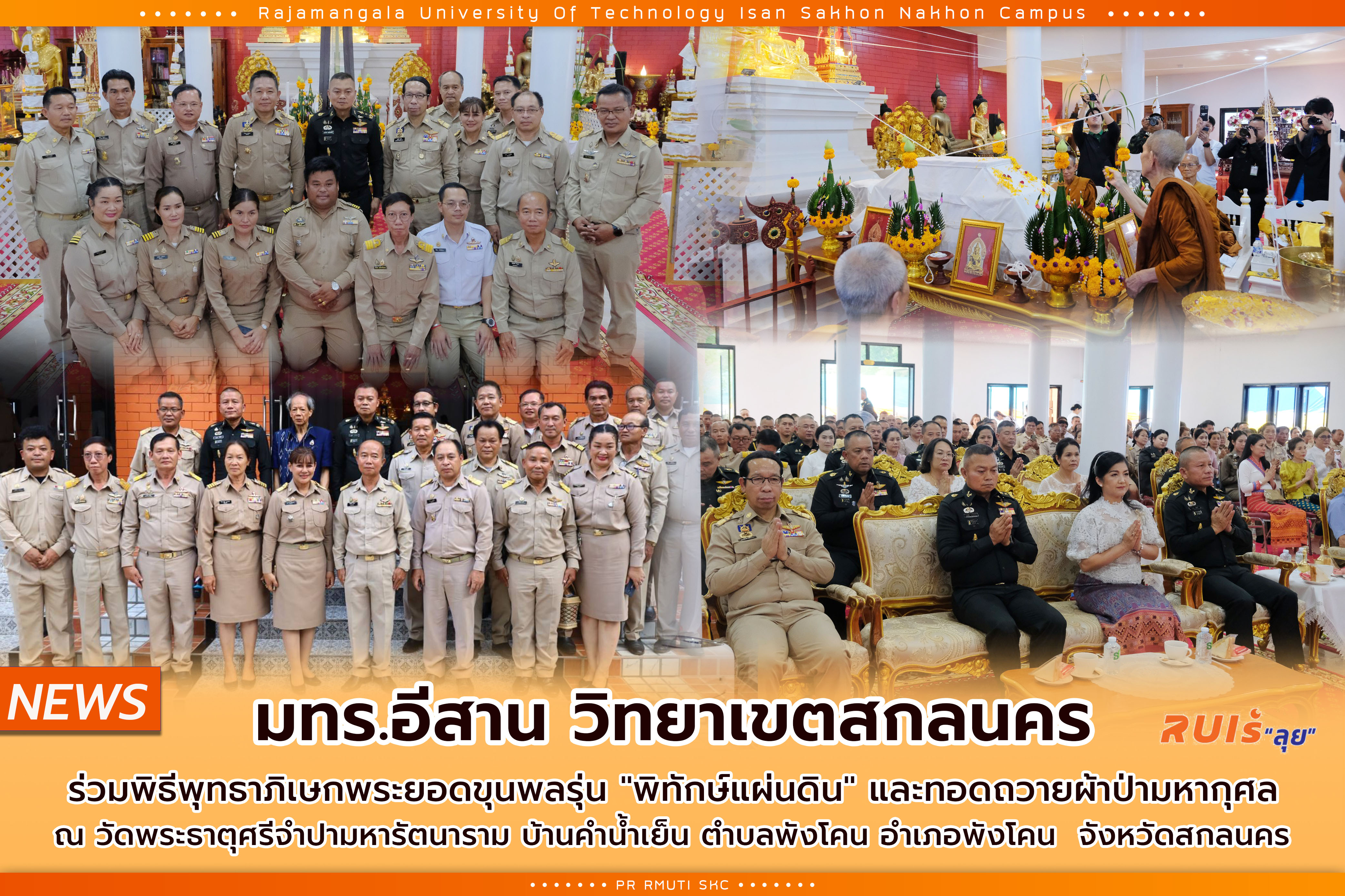 วันพุธที่ 2 กรกฎาคม 2568 มหาวิทยาลัยเทคโนโลยีราชมงคลอีสาน วิทยาเขตสกลนคร นำโดย ผศ.น.สพ.ดร.ชเวง สารคล่อง รองอธิการบดีประจำวิทยาเขตสกลนคร ร่วมพิธีพุทธาภิเษกพระเครื่องพระยอดขุนพลรุ่น "พิทักษ์แผ่นดิน" และทอดถวายผ้าป่ามหากุศล โครงการบูรณะปฏิสังขรณ์ "องค์พระมหาธาตุเจดีย์ศรีจำปามหารัตนมณี" และ "องค์พระพุทธสิหิงค์มิ่งมงคลบรมบพิตร" พร้อมด้วย น. พล.ท.บุญสิน พาดกลาง แม่ทัพภาคที่ 2 พร้อมด้วย คุณสุพางค์พรรณ พาดกลาง ประธานชมรมแม่บ้านทหารบกสาขากองทัพภาคที่ 2 เป็นประธานประกอบพิธีพุทธาภิเษกฯ โดยมี นายชูศักดิ์ รู้ยิ่ง ผู้ว่าราชการจังหวัดสกลนคร พล.ต.ท.อรรคพงศ์ พิมลศิริ ผู้ทรงคุณวุฒิพิเศษ ตร. รรท. รอง ผบช.ภ.4 พล.ต.ยงยุทธ ขันทวี ผบ.มทบ.29 พล.ต.อรรถชัย รักษาศิลป์ ผบ.มทบ.21 นายอำเภอพังโคน หัวหน้าส่วนราชการ ทหาร ตำรวจ องค์กรปกครองส่วนท้องถิ่น กำนัน ผู้ใหญ่บ้าน และพุทธศาสนิกชนร่วมพิธี ณ วัดพระธาตุศรีจำปามหารัตนาราม บ้านคำน้ำเย็น ตำบลพังโคน อำเภอพังโคน จังหวัดสกลนคร ซึ่งมีพระอาจารย์ต้นบุญ ปุญฺญวฑฺฒโน เป็นประธานสงฆ์วัดพระธาตุศรีจำปามหารัตนาราม พร้อมกันนี้ได้จัดให้มีพิธีพุทธาภิเษกพระยอดขุนพลรุ่น "พิทักษ์แผ่นดิน" เพื่อนำไปมอบให้แก่ทหารและกำลังพลในสังกัดกองทัพภาคที่ 2 ซึ่งปฏิบัติภารกิจอยู่ตามแนวเขตชายแดน เพื่อเป็นขวัญเป็นกำลังใจปกป้องคุ้มครองเหล่าทหารกล้าให้ปลอดภัยจากภยันตรายทั้งปวงในการปฏิบัติหน้าที่ปกป้องอธิปไตยของชาติ