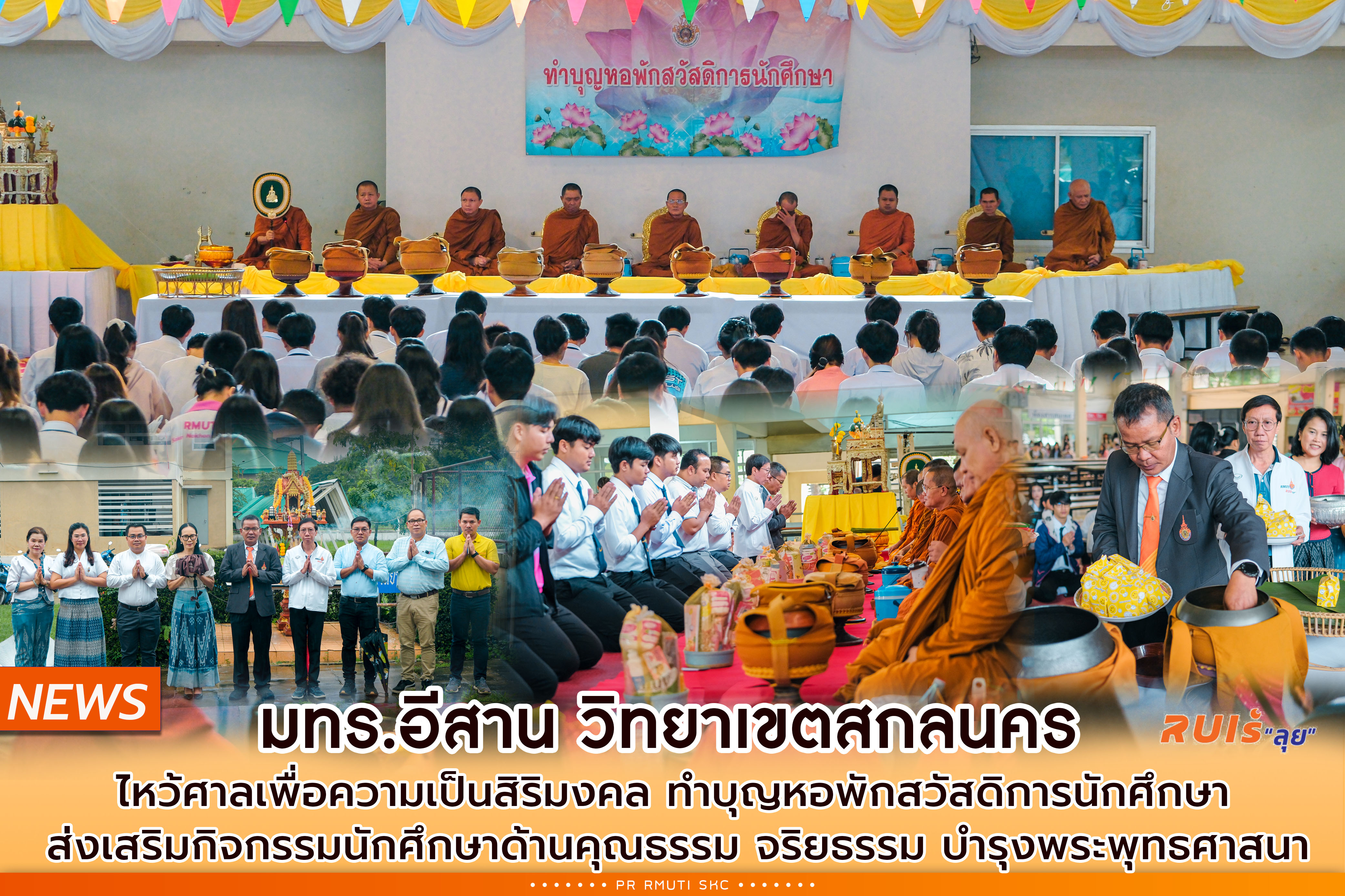 วันที่ 4 กรกฎาคม 2568 มหาวิทยาลัยเทคโนโลยีราชมงคลอีสาน วิทยาเขตสกลนคร จัดพิธีไหว้ศาลเพื่อความเป็นสิริมงคล และพิธีทำบุญหอพักสวัสดิการนักศึกษา เนื่องในโอกาสเปิดภาคการศึกษาใหม่ ประจำปี 2568 นำโดย ผศ.น.สพ.ดร.ชเวง สารคล่อง รองอธิการบดีประจำวิทยาเขตสกลนคร พร้อมด้วยคณะผู้บริหาร คณาจารย์ บุคลากร และนักศึกษาเข้าร่วมกิจกรรมอย่างพร้อมเพรียง เริ่มต้นด้วยพิธีสักการะพระพุทธประทานพรฯ ศาลปู่ย่า และศาลหน้าหอพักสวัสดิการนักศึกษา เพื่อเสริมสร้างขวัญกำลังใจและความเป็นสิริมงคลให้กับนักศึกษาและบุคลากรในช่วงต้นปีการศึกษาใหม่ 2568 จากนั้นได้จัดพิธีทำบุญตักบาตรพระสงฆ์จำนวน 9 รูป ณ อาคารบริการกลาง (Center Hall) เพื่อความเป็นสิริมงคล และส่งเสริมคุณธรรม จริยธรรม ตลอดจนการมีส่วนร่วมในการบำรุงพระพุทธศาสนาในหมู่นักศึกษา