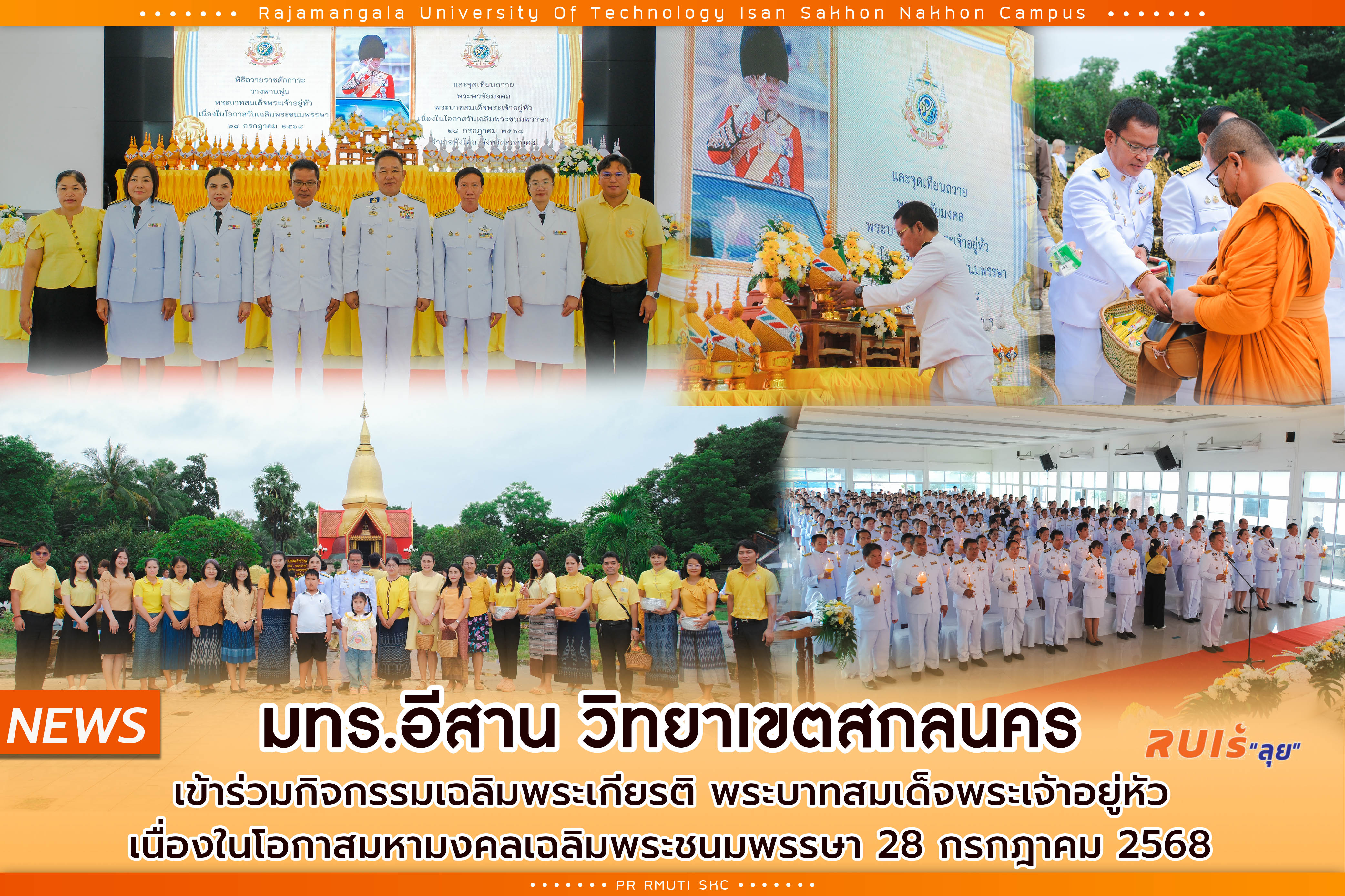 28 กรกฎาคม 2568 คณะผู้บริหาร คณาจารย์ บุคลากร มทร.อีสาน วิทยาเขตสกลนคร ร่วมกิจกรรมเนื่องในโอกาสวันเฉลิมพระชนมพรรษา 28 กรกฎาคม พระบาทสมเด็จพระปรเมนทรรามาธิบดี ศรีสินทรมหาวชิราลงกรณฯ พระวชิรเกล้าเจ้าอยู่หัว โดยในช่วงเช้า มทร.อีสาน วิทยาเขตสกลนคร นำโดย ผศ.น.สพ.ดร.ชเวง สารคล่อง รองอธิการบดีประจำวิทยาเขตสกลนคร และบุคลากรเข้าร่วมพิธีทำบุญตักบาตรพระสงฆ์จำนวน 74 รูป เพื่อถวายเป็นพระราชกุศล ณ บริเวณวัดศรีจำปาชนบท และได้เข้าร่วมพิธีถวายเครื่องราชสักการะและวางพานพุ่มและพิธีจุดเทียนถวายพระพรชัยมงคล พระบาทสมเด็จพระปรเมนทรรามาธิบดี ศรีสินทรมหาวชิราลงกรณพระวชิรเกล้าเจ้าอยู่หัว ณ หอประชุมที่ว่าการอำเภอพังโคน จังหวัดสกลนคร