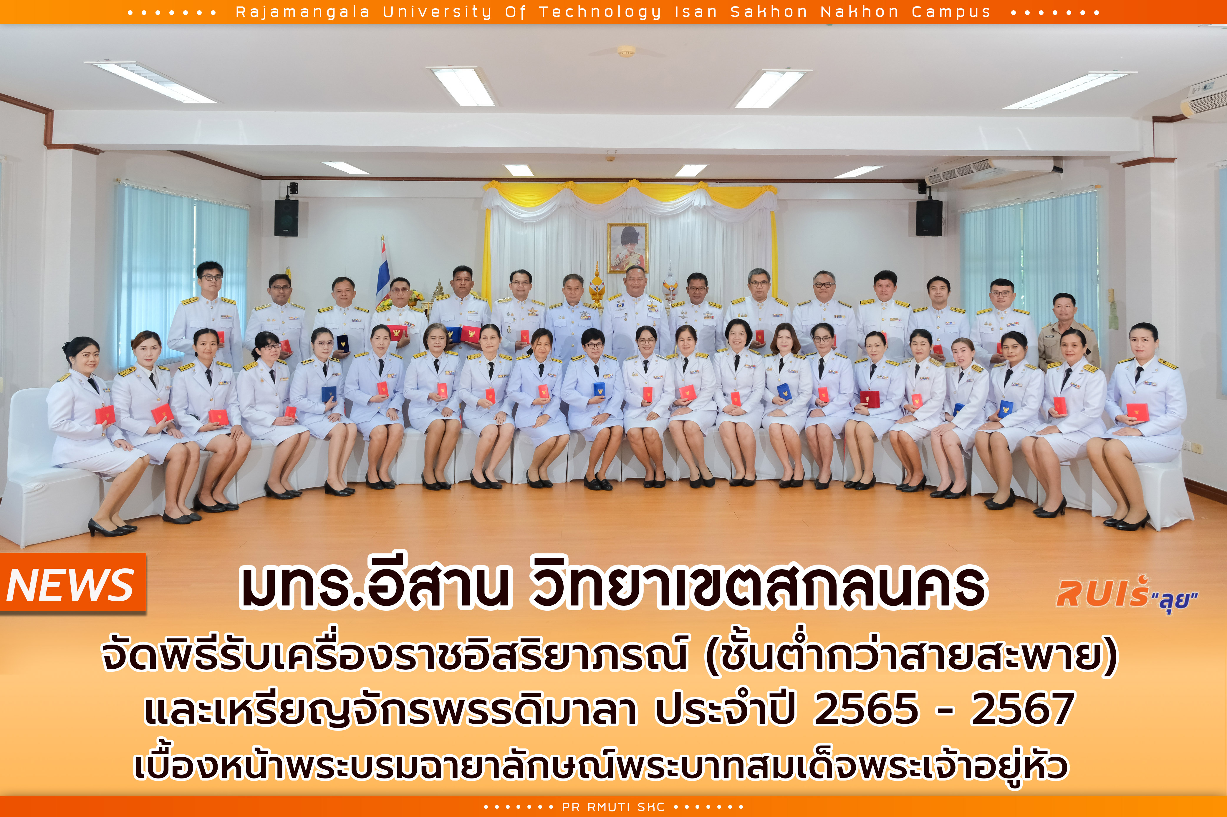 วันที่ 29 กรกฎาคม 2568 มทร.อีสาน วิทยาเขตสกลนคร นำโดย ผศ.น.สพ.ดร.ชเวง สารคล่อง รองอธิการบดีประจำวิทยาเขตสกลนคร พร้อมด้วยคณะผู้บริหาร คณาจารย์ และบุคลากร ร่วมให้การต้อนรับ รศ.ดร.โฆษิต ศรีภูธร อธิการบดีมหาวิทยาลัยเทคโนโลยีราชมงคลอีสาน ได้ให้เกียรติเป็นประธานในพิธีรับพระราชทานเครื่องราชอิสริยาภรณ์ (ชั้นต่ำกว่าสายสะพาย) และเหรียญจักรพรรดิมาลา ประจำปี 2565 ประจำปี 2566 และประจำปี 2567 เบื้องหน้าพระบรมฉายาลักษณ์พระบาทสมเด็จพระเจ้าอยู่หัว เพื่อเป็นการสร้างขวัญและกำลังใจสำหรับผู้ประพฤติดีในการปฏิบัติงานราชการ หรือปฏิบัติงานราชการงานที่เป็นประโยชน์แก่สาธารณชนด้วยความอุตสาหะ ซื่อสัตย์ และเอาใจใส่ต่อหน้าที่อย่างดียิ่ง ณ ห้องประชุมค้ำคูณ 7 อาคารวิจัยและพัฒนาชั้น 2 มทร.อีสาน วิทยาเขตสกลนคร