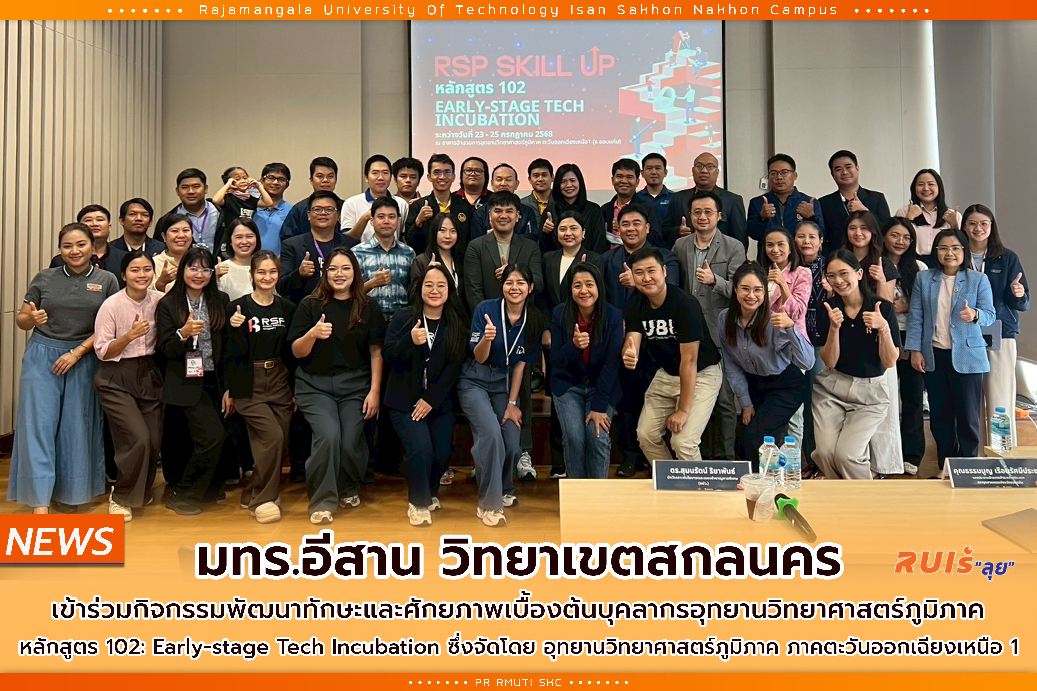 มหาวิทยาลัยเทคโนโลยีราชมงคลอีสาน วิทยาเขตสกลนคร ร่วมพัฒนาศักยภาพบุคลากรในกิจกรรม Early-stage Tech Incubation เพื่อขับเคลื่อนนวัตกรรมภาคอีสาน มหาวิทยาลัยเทคโนโลยีราชมงคลอีสาน วิทยาเขตสกลนคร ได้เข้าร่วมกิจกรรมพัฒนาทักษะและศักยภาพเบื้องต้นบุคลากรอุทยานวิทยาศาสตร์ภูมิภาค ประจำปีงบประมาณ 2568 ในหลักสูตร 102: Early-stage Tech Incubation ซึ่งจัดโดย อุทยานวิทยาศาสตร์ภูมิภาค ภาคตะวันออกเฉียงเหนือ 1 ระหว่างวันที่ 23 – 25 กรกฎาคม 2568 ณ อาคารอำนวยการอุทยานวิทยาศาสตร์ภูมิภาค ภาคตะวันออกเฉียงเหนือ 1 จังหวัดขอนแก่น กิจกรรมดังกล่าวมีวัตถุประสงค์เพื่อพัฒนาบุคลากรให้มีความรู้ ความสามารถ และทักษะที่จำเป็นต่อการทำงานด้านนวัตกรรม รวมถึงการเสริมสร้างสมรรถนะในการดำเนินงานภายใต้บริบทของพื้นที่ภาคตะวันออกเฉียงเหนือ อันจะนำไปสู่การขับเคลื่อนระบบนวัตกรรมในระดับภูมิภาค พร้อมทั้งสร้างเครือข่ายความร่วมมือระหว่าง อุทยานวิทยาศาสตร์ภูมิภาค ภาคการศึกษา ภาครัฐ และภาคเอกชน อย่างเข้มแข็งและยั่งยืน สำหรับผู้แทนจากมหาวิทยาลัยเทคโนโลยีราชมงคลอีสาน วิทยาเขตสกลนคร และเครือข่ายภาคีที่เข้าร่วมกิจกรรมในครั้งนี้ ประกอบด้วย ผู้ช่วยศาสตราจารย์นำพน พิพัฒน์ไพบูลย์ – บุคลากรในสังกัดที่ดำเนินงานอุทยานวิทยาศาสตร์ นางสาวชลาลัย เหง้าน้อย – บุคลากรในสังกัดที่ดำเนินงานอุทยานวิทยาศาสตร์ ผู้ช่วยศาสตราจารย์ศุกฤชชญา เหมะธุลิน – บุคลากรจากภาคการศึกษา นายกิตติพงษ์ รักบุญ – บุคลากรภาครัฐ (นักพัฒนาการชุมชนปฏิบัติการ อำเภอส่องดาว) นางนวลปราง ซ้ายกลาง – บุคลากรภาคเอกชน (วิสาหกิจชุมชนเกษตรและสหกรณ์ปูแดงบ้านน้ำพุ) การเข้าร่วมกิจกรรมในครั้งนี้ถือเป็นอีกหนึ่งก้าวสำคัญในการพัฒนาทุนมนุษย์เพื่อสนับสนุนระบบนวัตกรรมระดับภูมิภาคให้เกิดผลอย่างเป็นรูปธรรม พร้อมต่อยอดสู่การพัฒนาธุรกิจนวัตกรรมและยกระดับเศรษฐกิจฐานรากให้เข้มแข็งและยั่งยืนในอนาคต
