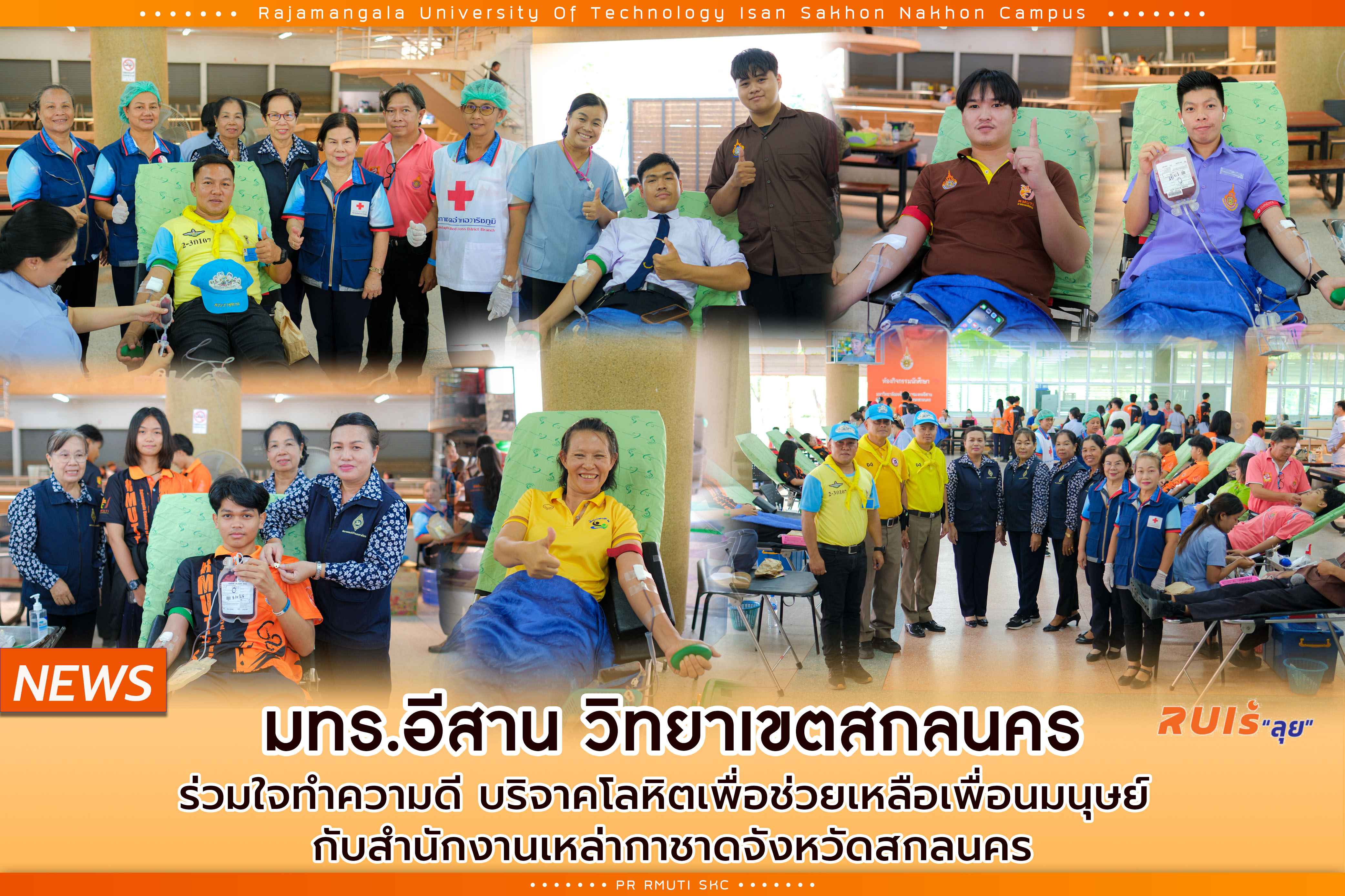 5 สิงหาคม 2568 มทร.อีสาน วิทยาเขตสกลนคร นำโดย ผศ.น.สพ.ดร.ชเวง สารคล่อง รองอธิการบดีประจำวิทยาเขตสกลนคร พร้อมด้วยคณะผู้บริหาร คณาจารย์ บุคลากร และนักศึกษา ร่วมใจทำความดี บริจาคโลหิตเพื่อช่วยเหลือเพื่อนมนุษย์กับสำนักงานเหล่ากาชาดจังหวัดสกลนคร ณ อาคารอเนกประสงค์ (อาคาร 5) การจัดกิจกรรมในครั้งนี้เป็นการแสดงความเสียสละเพื่อสังคมส่วนรวม โดยการบริจาคโลหิตถือเป็นการให้ที่ยิ่งใหญ่ ที่สามารถช่วยต่อชีวิตให้กับผู้ป่วยที่ต้องการโลหิตในการรักษา ซึ่งการบริจาคเลือด 1 ครั้งสามารถช่วยต่อชีวิตให้กับผู้ป่วยได้ถึง 3 คน การบริจาคโลหิตในครั้งนี้ถือเป็นการร่วมมือกันอย่างดีระหว่างมหาวิทยาลัยและเหล่ากาชาดจังหวัดสกลนคร เพื่อให้เกิดประโยชน์สูงสุดในการช่วยเหลือผู้ที่ต้องการโลหิตอย่างเร่งด่วนในช่วงเวลาสำคัญ