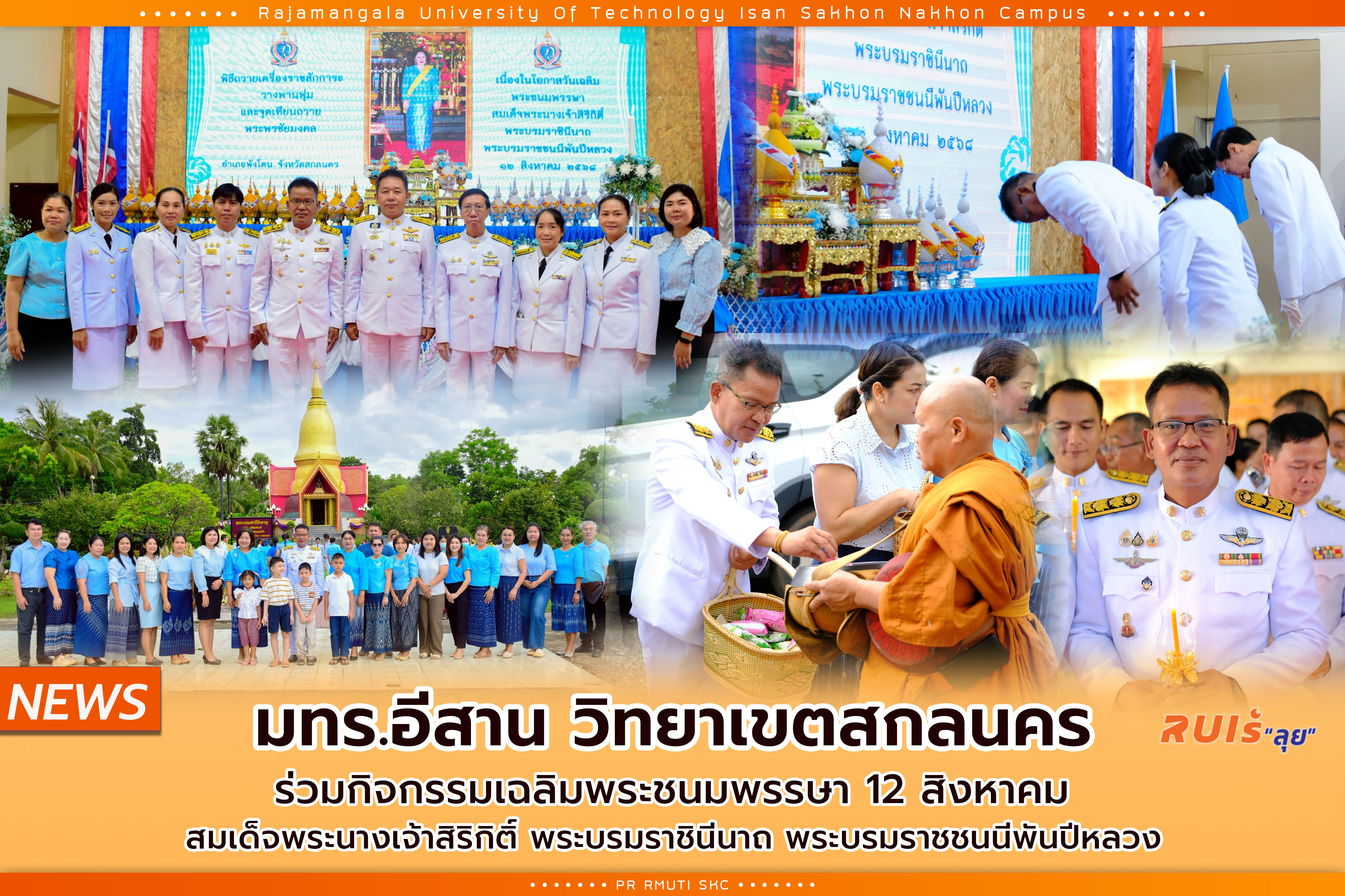 12 สิงหาคม 2568 คณะผู้บริหาร คณาจารย์ บุคลากร มทร.อีสาน วิทยาเขตสกลนคร นำโดย ผู้ช่วยศาสตราจารย์ น.สพ.ดร.ชเวง สารคล่อง รองอธิการบดีประจำวิทยาเขตสกลนคร ร่วมกิจกรรมเนื่องในโอกาสวันเฉลิมพระชนมพรรษา 12 สิงหาคม สมเด็จพระนางเจ้าสิริกิติ์ พระบรมราชินีนาถ พระบรมราชชนนีพันปีหลวง โดยได้ร่วมพิธีทำบุญตักบาตรพระสงฆ์ เพื่อถวายเป็นพระราชกุศล ณ วัดป่าศรีจำปาชนบท และเข้าร่วมพิธีถวายเครื่องราชสักการะและวางพานพุ่มและพิธีจุดเทียนถวายพระพรชัยมงคล สมเด็จพระนางเจ้าสิริกิติ์ พระบรมราชินีนาถ พระบรมราชชนนีพันปีหลวง ณ หอประชุมพังโคนวิทย์รวมใจ โรงเรียนพังโคนวิทยาคม จังหวัดสกลนคร