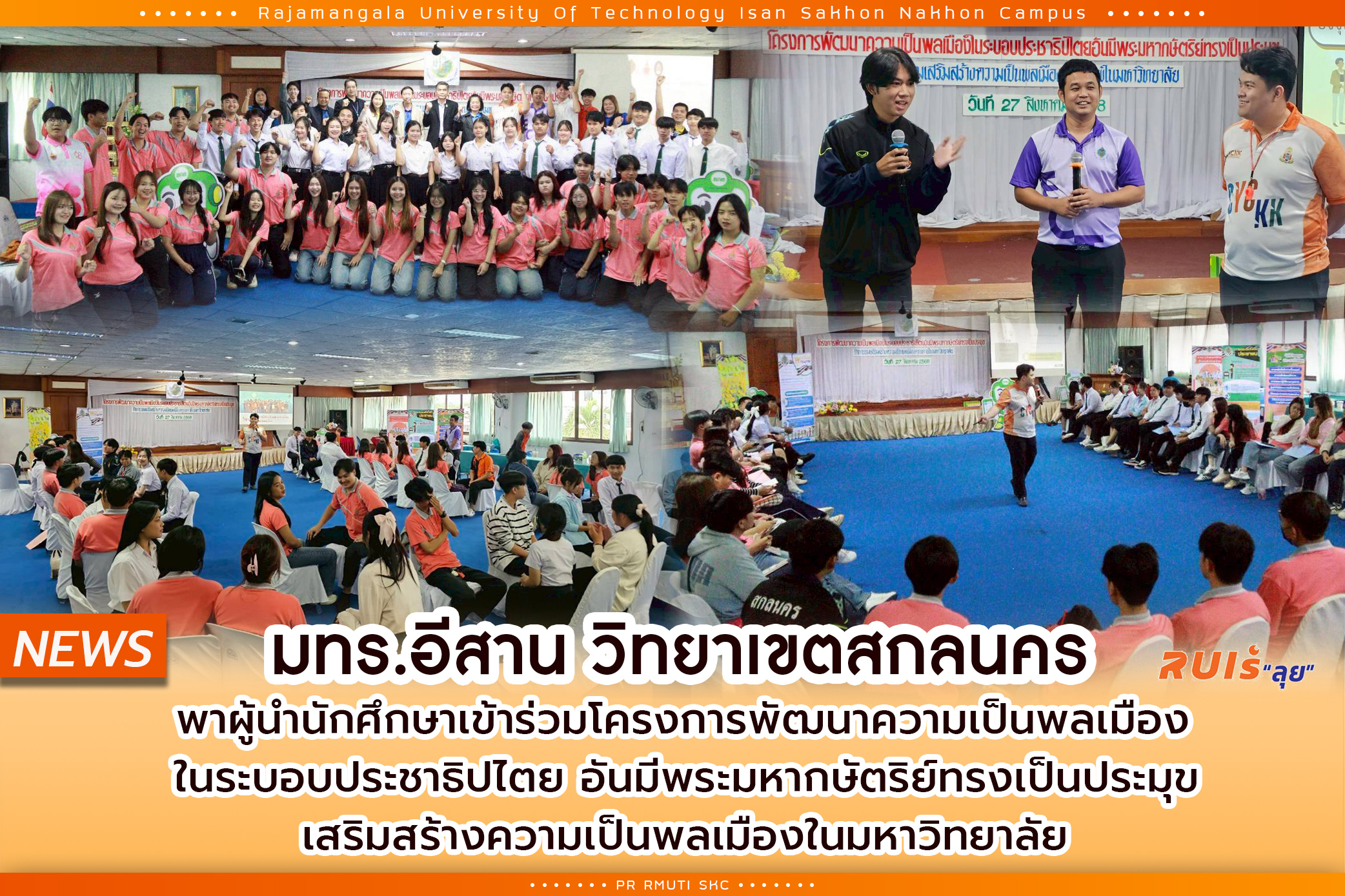 วันที่ 27 สิงหาคม 2568 มทร.อีสาน วิทยาเขตสกลนคร นำโดย ผู้ช่วยศาสตราจารย์ น.สพ.ดร.ชเวง สารคล่อง รองอธิการบดีประจำวิทยาเขตสกลนคร มอบหมายให้นายภควัต นครินทร์สาคร รักษาการในตำแหน่งผู้อำนวยการสำนักงานวิทยาเขตสกลนคร อาจารย์ ดร.เรืองชัย ตาแสง ผู้ช่วยคณบดีด้านพัฒนากิจกรรมนักศึกษา คณะอุตสาหกรรมและเทคโนโลยี และแผนกงานพัฒนานักศึกษาและเครือข่ายสัมพันธ์ พาผู้นำนักศึกษาในมหาวิทยาลัยฯ จำนวน 30 คน ร่วมกับผู้นำนักศึกษามหาวิทยาลัยราชภัฎสกลนคร เข้าร่วมโครงการพัฒนาความเป็นพลเมืองในระบอบประชาธิปไตยอันมีพระมหากษัตริย์ทรงเป็นประมุข เสริมสร้างความเป็นพลเมืองในมหาวิทยาลัย กิจกรรมในครั้งนี้มีวัตถุประสงค์เพื่อส่งเสริม วิถีประชาธิปไตยและการมีส่วนร่วมสร้างเครือข่ายการเลือกตั้งในมหาวิทยาลัย โดยนักศึกษาได้เข้าร่วมการบรรยายให้ความรู้ การเสวนาเชิงวิชาการ และกิจกรรมเชิงปฏิบัติการ (Workshop) เพื่อฝึกทักษะการเป็นผู้นำ การทำงานเป็นทีม และการมีส่วนร่วมในกระบวนการประชาธิปไตยอย่างสร้างสรรค์ ซึ่งจะเป็นประโยชน์ต่อการดำเนินชีวิตในสังคมและการพัฒนาประเทศชาติในอนาคต ณ โรงแรมสกลแกรนด์พาเลซ จังหวัดสกลนคร