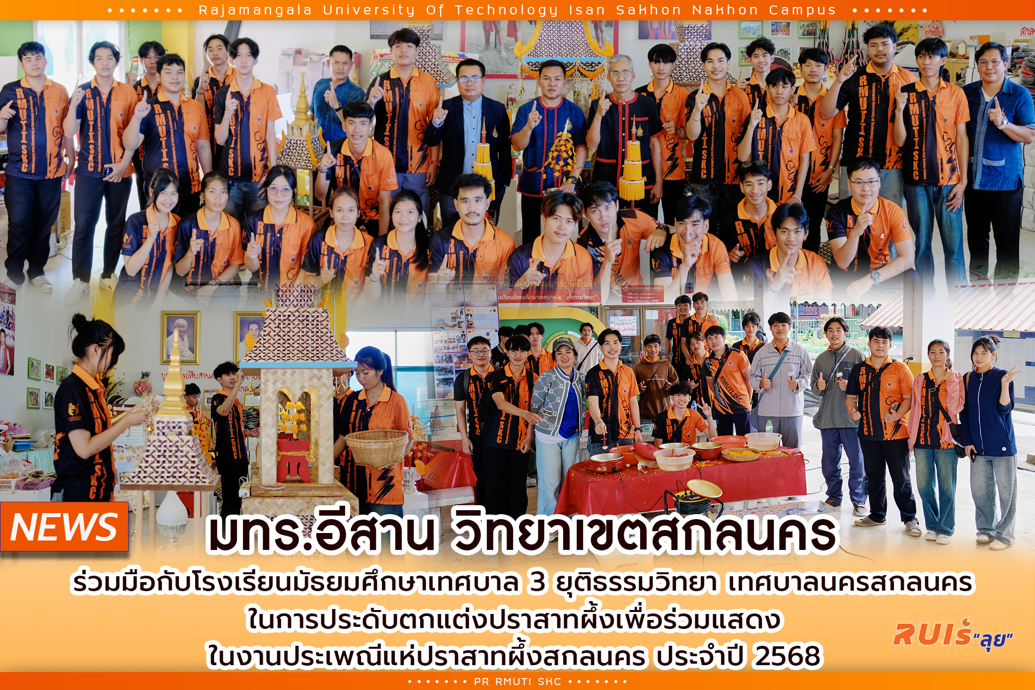 วันที่ 23 กันยายน 2568 มทร.อีสาน วิทยาเขตสกลนคร นำโดย ผู้ช่วยศาสตราจารย์ น.สพ.ดร.ชเวง สารคล่อง รองอธิการบดีประจำวิทยาเขตสกลนคร ได้มอบหมายให้นายอนุชา ผิวคำ หัวหน้าแผนกงานพัฒนานักศึกษาและเครือข่ายสัมพันธ์ นำนักศึกษามหาวิทยาลัยฯ และเจ้าหน้าที่ เข้าร่วมกิจกรรมปราสาทผึ้งสร้างสรรค์ งานประเพณีแห่ปราสาทผึ้ง จังหวัดสกลนคร ประจำปี 2568 ในการนี้ มหาวิทยาลัยฯ ได้ร่วมมือกับโรงเรียนมัธยมศึกษาเทศบาล 3 ยุติธรรมวิทยา เทศบาลนครสกลนคร ในการประดับตกแต่งปราสาทผึ้งเพื่อร่วมแสดงในงาน โดยกิจกรรมดังกล่าวมีการบันทึกภาพและจัดทำสื่อวีดิทัศน์เพื่อประชาสัมพันธ์โดยมหาวิทยาลัยราชภัฏสกลนคร กิจกรรมนี้ถือเป็นอีกหนึ่งความร่วมมือระหว่างสถาบันการศึกษาในพื้นที่ ที่ร่วมกันส่งเสริมและสืบสานประเพณีท้องถิ่นให้คงอยู่ พร้อมทั้งเสริมสร้างประสบการณ์และจิตสำนึกด้านวัฒนธรรมให้แก่นักศึกษาและเยาวชนในชุมชน ณ โรงเรียนมัธยมศึกษาเทศบาล 3 ยุติธรรมวิทยา เทศบาลนครสกลนคร จังหวัดสกลนคร