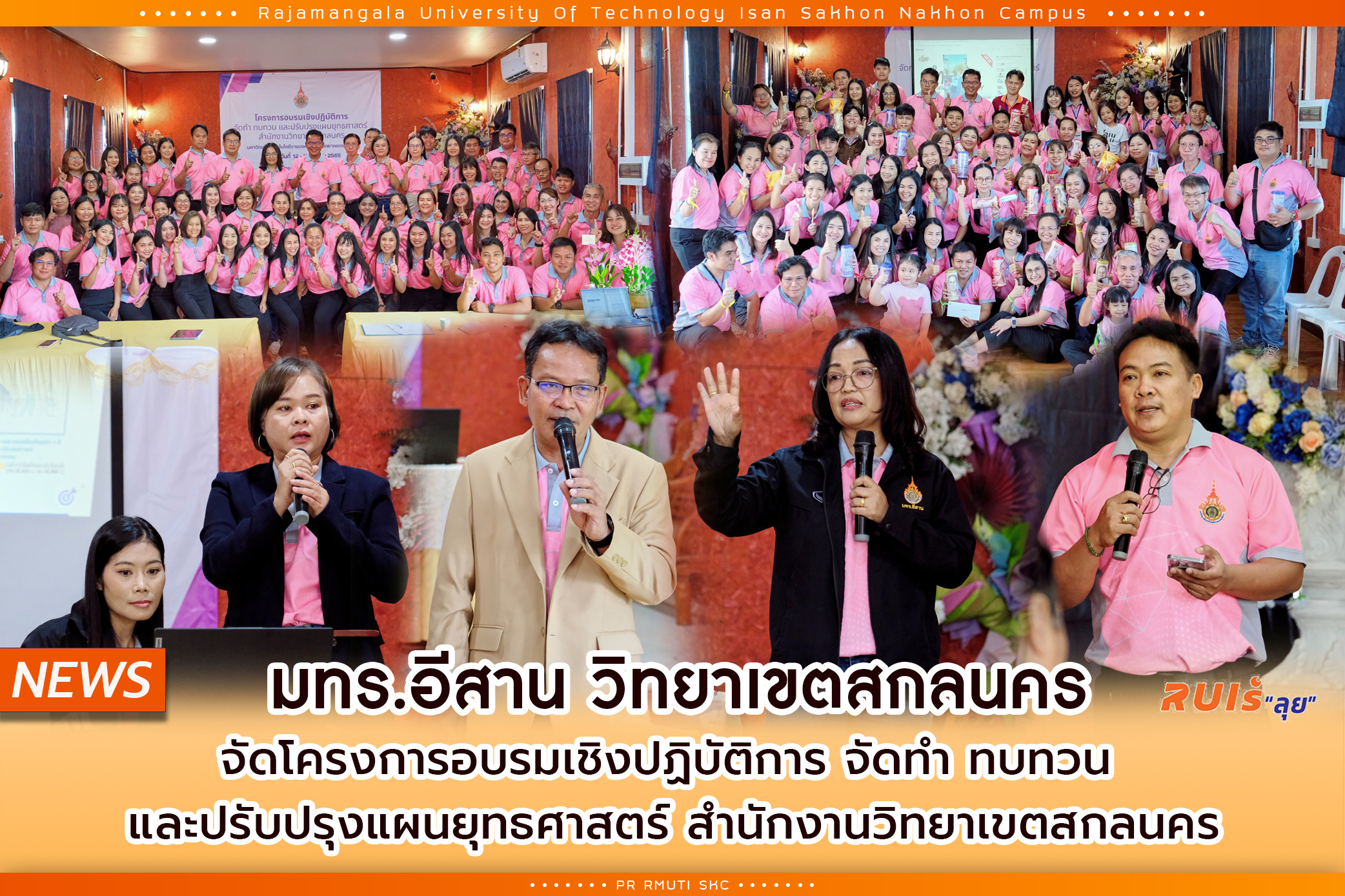 สำนักงานวิทยาเขตสกลนคร มทร.อีสาน ได้จัดโครงการอบรมเชิงปฏิบัติการ จัดทำ ทบทวน และปรับปรุงแผนยุทธศาสตร์ ระหว่างวันที่ 12 – 13 ตุลาคม 2568 ณ นาฝายคันทรีวิวแอนด์รีสอร์ต อำเภอภูผาม่าน จังหวัดขอนแก่น โดยได้รับเกียรติจาก ผู้ช่วยศาสตราจารย์ น.สพ.ดร.ชเวง สารคล่อง รองอธิการบดีประจำวิทยาเขตสกลนคร เป็นประธานในพิธีเปิด โครงการครั้งนี้จัดขึ้นเพื่อเป็นเวทีแลกเปลี่ยนความคิดเห็น ทบทวน ปรับปรุง และวางแนวทางการดำเนินงานตามแผนยุทธศาสตร์ของวิทยาเขตสกลนครให้มีความสอดคล้องกับบริบทที่เปลี่ยนแปลง และสอดรับกับทิศทางการพัฒนามหาวิทยาลัยในอนาคต โดยภายในงานมีการบรรยายเชิงวิชาการและแลกเปลี่ยนความรู้ในหัวข้อที่น่าสนใจจากผู้บริหาร ได้แก่ หัวข้อ “ยุทธศาสตร์ในการพัฒนามหาวิทยาลัยเทคโนโลยีราชมงคลอีสาน วิทยาเขตสกลนคร คลัสเตอร์ Health & Wellness” โดย ผู้ช่วยศาสตราจารย์ น.สพ.ดร.ชเวง สารคล่อง รองอธิการบดีประจำวิทยาเขตสกลนคร หัวข้อ “กุญแจสู่ความสำเร็จ” โดย ผู้ช่วยศาสตราจารย์ ดร.นำพน พิพัฒน์ไพบูลน์ ผู้ช่วยอธิการบดี หัวข้อ “ทักษะที่จำเป็นใน Smart Office” โดย ผู้ช่วยศาสตราจารย์ ดร.จันทิมา พรหมเกษ ผู้ช่วยอธิการบดี หัวข้อ “การเข้าสู่ตำแหน่งที่สูงขึ้นของบุคลากรสายสนับสนุน” โดย นางนุชจรีย์ สตางรัตน์ รักษาการในตำแหน่งผู้อำนวยการสำนักงานวิทยาเขตสกลนคร นอกจากนี้ในช่วงบ่าย ยังได้มีการจัดกิจกรรมสันทนาการเพื่อสร้างความสัมพันธ์ในองค์กรและเสริมสร้างทีมงานให้มีความแข็งแกร่ง โดยได้รับเกียรติจากวิทยากรพิเศษ คุณสุรเชษฐ์ ชิณเทศ และทีมงานสตาฟ มาดำเนินกิจกรรมสร้างบรรยากาศที่สนุกสนานและเป็นกันเอง และในช่วงท้ายของโครงการได้มีการนำเสนอผลการวิเคราะห์ภาพรวมการดำเนินงานและการพัฒนายุทธศาสตร์ โดยหัวหน้างานในสำนักงานวิทยาเขตสกลนคร ซึ่งถือเป็นส่วนสำคัญในการสรุปบทเรียนและกำหนดแนวทางขับเคลื่อนองค์กรให้มีประสิทธิภาพมากยิ่งขึ้นในอนาคต