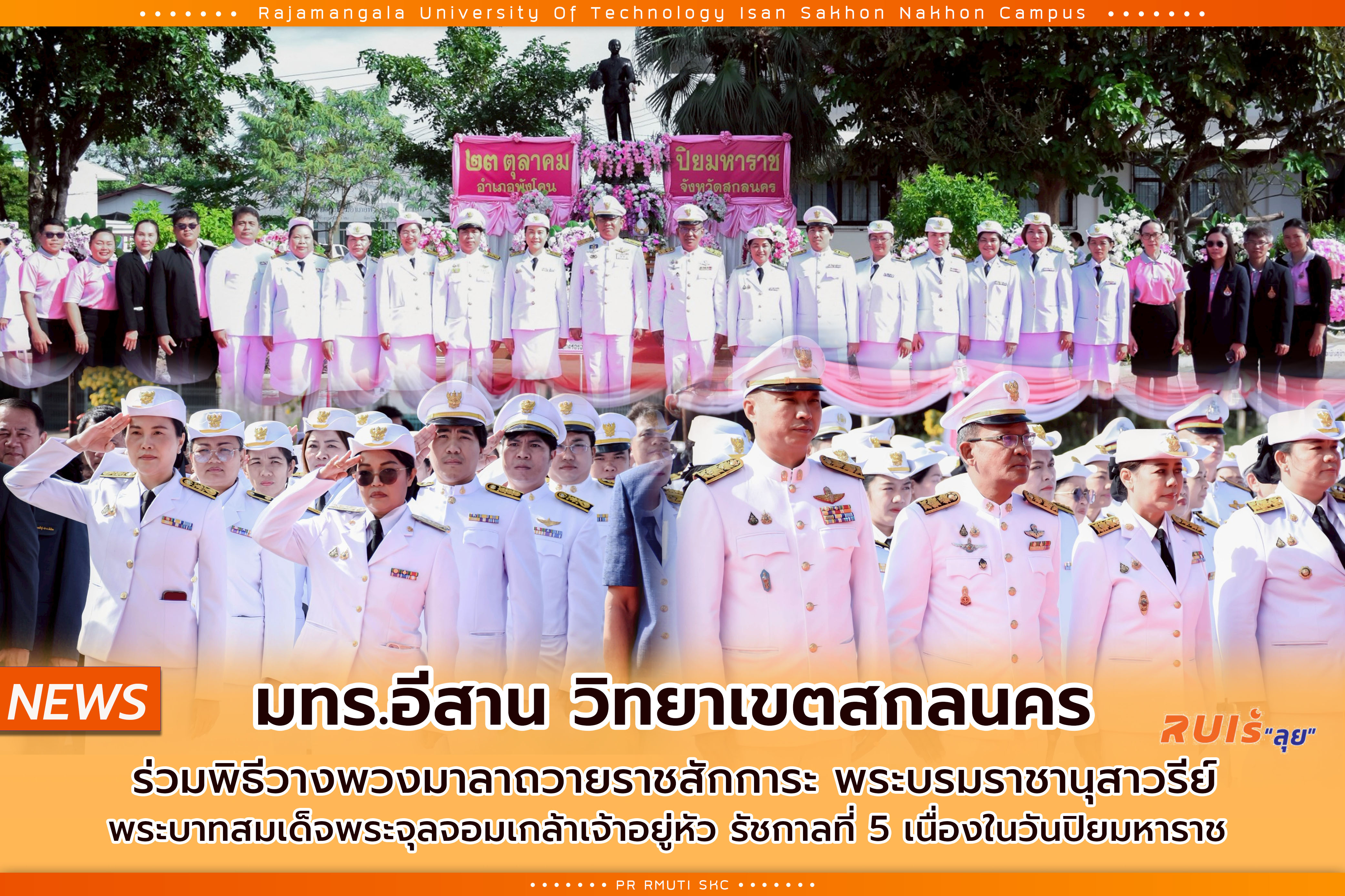 วันที่ 23 ตุลาคม 2568 โดย ผศ.น.สพ.ดร.ชเวง สารคล่อง รองอธิการบดีประจำวิทยาเขตสกลนคร พร้อมด้วย ผู้บริหาร คณาจารย์ และเจ้าหน้าที่ มทร.อีสาน วิทยาเขตสกลนคร ร่วมพิธีวางพวงมาลาถวายราชสักการะ พระบรมราชานุสาวรีย์ พระบาทสมเด็จพระจุลจอมเกล้าเจ้าอยู่หัว รัชกาลที่ 5 เนื่องในวันปิยมหาราช เพื่อเป็นการรำลึกถึงพระมหากรุณาธิคุณของพระองค์ท่านที่มีต่อพสกนิกรชาวไทย โดยมีหัวหน้าส่วนราชการ ข้าราชการ ผู้นำชุมชน ผู้นำท้องถิ่น เข้าร่วมพิธีเป็นจำนวนมาก ณ ลานหน้าที่ว่าการอำเภอพังโคน จังหวัดสกลนคร