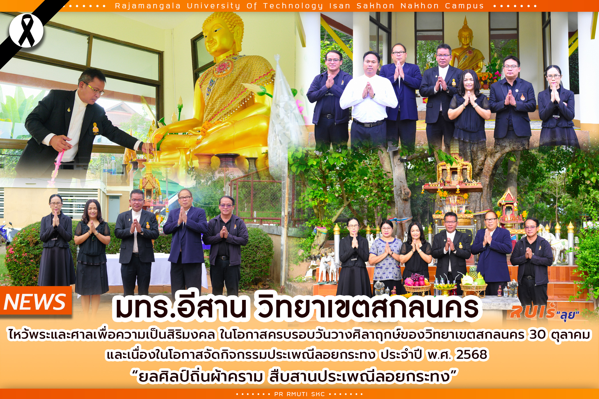 วันที่ 3 พฤศจิกายน 2568 มทร.อีสาน วิทยาเขตสกลนคร นำโดย ผู้ช่วยศาสตราจารย์ น.สพ.ดร.ชเวง สารคล่อง รองอธิการบดีประจำวิทยาเขตสกลนคร พร้อมด้วยคณะผู้บริหาร จัดพิธีไหว้ศาลเพื่อความเป็นสิริมงคล ในโอกาสครบรอบวันวางศิลาฤกษ์ของวิทยาเขตสกลนคร 30 ตุลาคม และเนื่องในโอกาสจัดกิจกรรมประเพณีลอยกระทง ประจำปี พ.ศ. 2568 “ยลศิลป์ถิ่นผ้าคราม สืบสานประเพณีลอยกระทง” เริ่มต้นด้วยพิธีสักการะพระพุทธประทานพรฯ ศาลปู่ย่า และศาลหน้าหอพักสวัสดิการนักศึกษา โดยกิจกรรมดังกล่าวเพื่อน้อมรำลึกในพระมหากรุณาธิคุณของสมเด็จพระนางเจ้าสิริกิติ์ พระบรมราชินีนาถ พระบรมราชชนนีพันปีหลวง ผู้ทรงมีพระมหากรุณาธิคุณอันยิ่งใหญ่ต่อปวงชนชาวไทย โดยเฉพาะด้านการส่งเสริม ศิลปหัตถกรรม และภูมิปัญญาท้องถิ่นไทย อันเป็นรากฐานสำคัญของการอนุรักษ์และสืบสานวัฒนธรรมของชาติให้คงอยู่สืบไป
