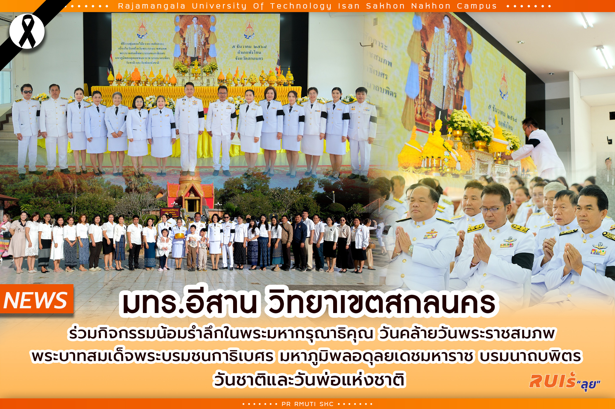 วันที่ 5 ธันวาคม 2568 คณะผู้บริหาร คณาจารย์ บุคลากร มทร.อีสาน วิทยาเขตสกลนคร นำโดย ผศ.น.สพ.ดร.ชเวง สารคล่อง รองอธิการบดีประจำวิทยาเขตสกลนคร ร่วมกิจกรรมน้อมรำลึกฯ ในพระมหากรุณาธิคุณเนื่องในวันคล้ายวันพระบรมราชสมภพ พระบาทสมเด็จพระบรมชนกาธิเบศร มหาภูมิพลอดุลยเดชมหาราช บรมนาถบพิตร 5 ธันวาคม โดยได้มีพิธีเจริญพระพุทธมนต์และทำบุญตักบาตรถวายพระราชกุศล ณ วัดศรีจำปาชนบท และพิธีวางพานพุ่มดอกไม้ถวายราชสักการะ เพื่อน้อมรำลึกในพระมหากรุณาธิคุณฯ ณ หอประชุมที่ว่าการอำเภอพังโคน จังหวัดสกลนคร