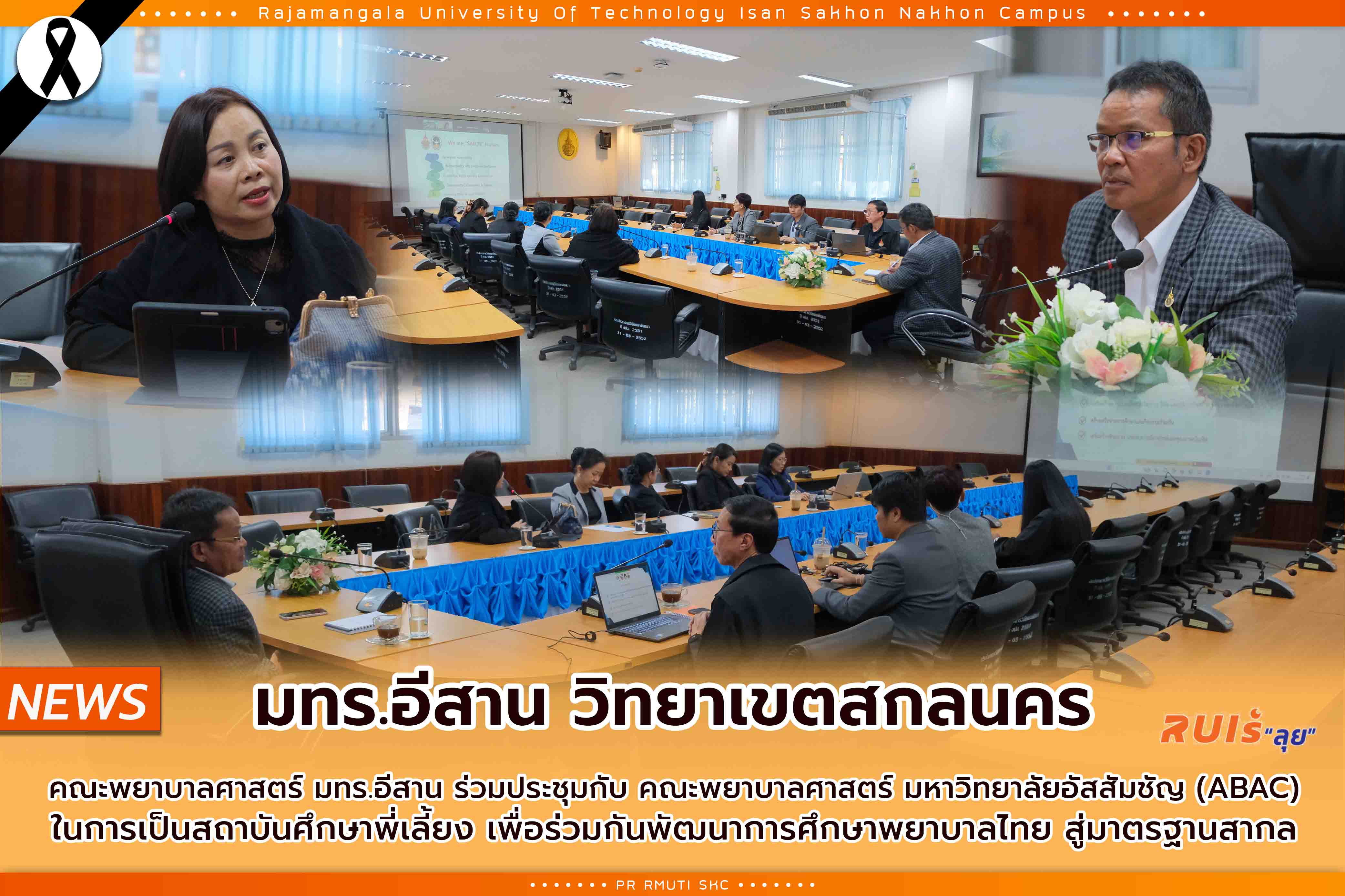 วันจันทร์ที่ 5 มกราคม 2569 คณะพยาบาลศาสตร์ มทร.อีสาน วิทยาเขตสกลนคร นำโดย ผศ.น.สพ.ดร.ชเวง สารคล่อง รองอธิการบดีประจำวิทยาเขตสกลนคร พร้อมด้วย ผศ.ดร.เพ็ญศิริ ดำรงภคภากร คณบดีคณะพยาบาลศาสตร์ คณะผู้บริหาร คณาจารย์ และเจ้าหน้าที่ ได้ร่วมประชุมทางวิชาการ (ระบบออน์ไลน์) กับ คณะพยาบาลศาสตร์ มหาวิทยาลัยอัสสัมชัญ (ABAC) ในการเข้าเป็น "สถาบันการศึกษาพี่เลี้ยง" เพื่อร่วมกันขับเคลื่อนและพัฒนาการศึกษา หลักสูตรพยาบาลศาสตร์สู่มาตรฐานสากล ณ ห้องประชุมค้ำคูณ 2 อาคารวิจัยและพัฒนา ชั้น 1 สำนักงานวิทยาเขตสกลนคร