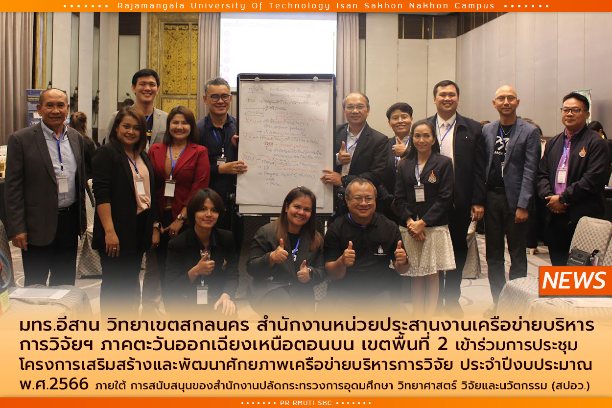 ผู้ช่วยศาสตราจารย์นำพน พิพัฒน์ไพบูลย์ ตำแหน่ง ผู้ช่วยอธิการบดี ในนามผู้ประสานงานฯ เขตพื้นที่ 2 พร้อมด้วย ผู้ช่วยศาสตราจารย์ศุกฤชชญา เหมะธุลิน และคณะ เป็นตัวแทนสำนักงานหน่วยประสานงานเครือข่ายบริหารการวิจัยฯ ภาคตะวันออกเฉียงเหนือตอนบน เขตพื้นที่ 2 ในการเข้าร่วมการประชุมโครงการเสริมสร้างและพัฒนาศักยภาพเครือข่ายบริหารการวิจัย ประจำปีงบประมาณ พ.ศ.2566 ภายใต้ การสนับสนุนของสำนักงานปลัดกระทรวงการอุดมศึกษา วิทยาศาสตร์ วิจัยและนวัตกรรม (สปอว.) โดยเครือข่ายบริหารงานวิจัยภาคเหนือตอนบน เป็นเจ้าภาพ ซึ่งได้กำหนดการประชุมในระหว่างวันที่ 11 - 12 กรกฎาคม 2567 ณ โรงแรมสุโกศล ถนนศรีอยุธยา กรุงเทพมหานคร พร้อมนำผลงานวิจัย เครื่องดื่มโปรตีนเข้มข้นจากแมลง (ซุปแมลงสกัด) เข้าร่วมการจัดแสดงนิทรรศการตัวอย่างผลงานวิจัย (Best practice) ด้วย