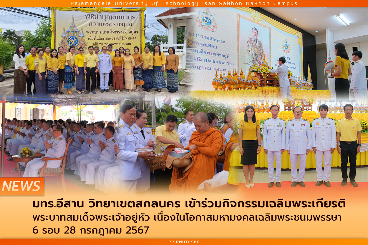 28 กรกฎาคม 2567 คณะผู้บริหาร คณาจารย์ บุคลากร มทร.อีสาน วิทยาเขตสกลนคร ร่วมกิจกรรมเนื่องในโอกาสวันเฉลิมพระชนมพรรษา 28 กรกฎาคม พระบาทสมเด็จพระปรเมนทรรามาธิบดี ศรีสินทรมหาวชิราลงกรณฯ พระวชิรเกล้าเจ้าอยู่หัว โดยในช่วงเช้า มทร.อีสาน วิทยาเขตสกลนคร นำโดย ผู้ช่วยศาสตราจารย์ อัมพร ภูศรีฐาน ผู้ช่วยอธิการบดี และบุคลากรเข้าร่วมพิธีทำบุญตักบาตรพระสงฆ์จำนวน 73 รูป เพื่อถวายเป็นพระราชกุศล ณ ลานหน้าที่ว่าการอำเภอพังโคน และในช่วงเย็น ได้เข้าร่วมพิธีถวายเครื่องราชสักการะและวางพานพุ่มและพิธีจุดเทียนถวายพระพรชัยมงคล พระบาทสมเด็จพระปรเมนทรรามาธิบดี ศรีสินทรมหาวชิราลงกรณพระวชิรเกล้าเจ้าอยู่หัว นำโดย นายภควัต นครินทร์สาคร รักษาการในตำแหน่งผู้อำนวยการสำนักงานวิทยาเขตสกลนคร พร้อมคณะผู้บริหาร คณาจารย์ บุคลากร เข้าร่วม ณ หอประชุมที่ว่าการอำเภอพังโคน จังหวัดสกลนคร