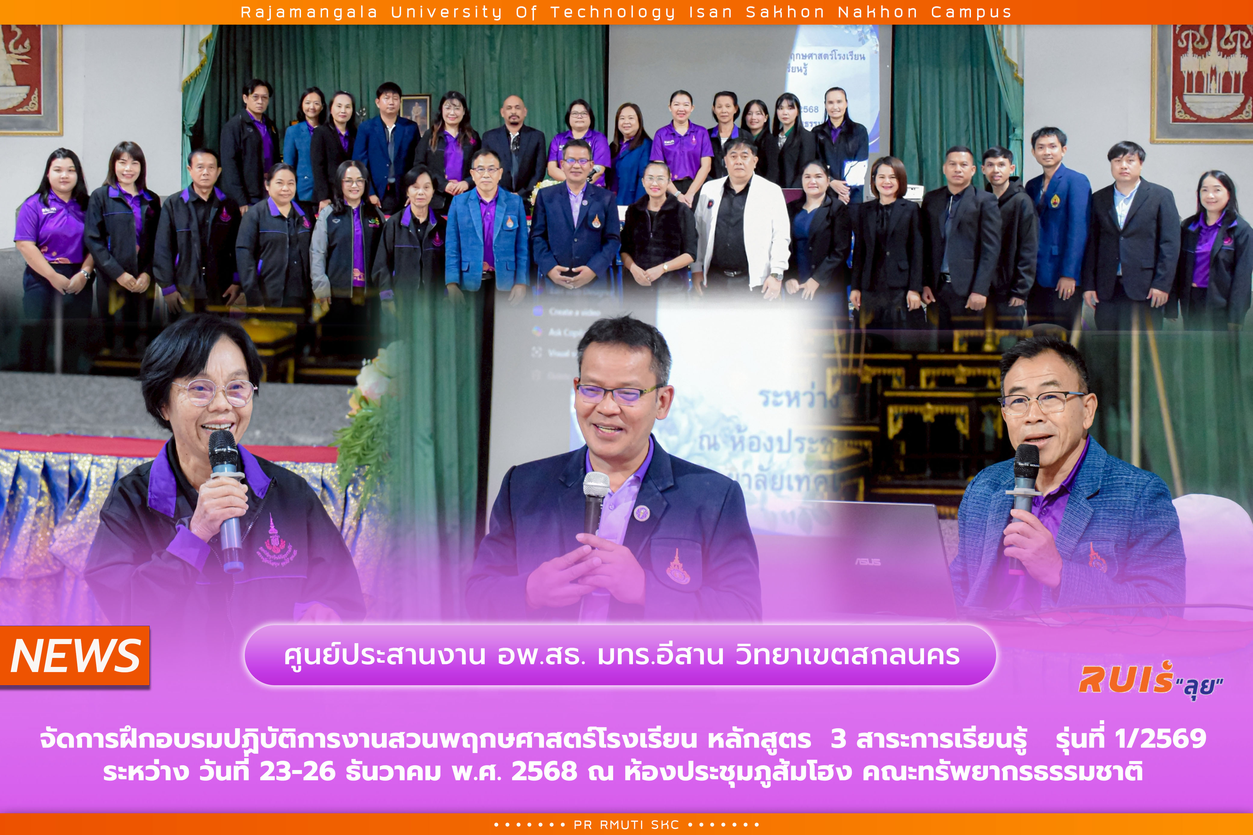 coordination center The Ministry of Public Health - Rajamangala University of Technology Isan Sakon Nakhon Campus Conducting a school botanical garden operations training project, course 3, learning subjects, class 1/2026, December 23-26, 2025 at Phu Som Hong conference room. Faculty of Natural Resources Rajamangala University of Technology Isan Sakon Nakhon Campus, with Asst. Prof. Dr. Chaweng Saraklong, Vice President of Sakon Nakhon Campus presided over the opening speech and Assistant Professor Dr. Chantima Promket, Assistant Rector He is the person who reports on the implementation of the project this time. with the objective To provide knowledge, understanding, and operational guidelines in accordance with the policy, direction, and goals of the Royal Initiative Plant Genetic Conservation Project. By being honored by Assistant Professor Amporn Phusrithan, Advisor to the Coordination Center, Mr. Jaren Thipthong, Mrs. Jaruwan Thipthong, Advisor to the Coordination Center and a group of lecturers from the coordination center The Ministry of Public Health - Rajamangala University of Technology Isan Sakon Nakhon Campus In the lecture to provide knowledge to the participants this time.