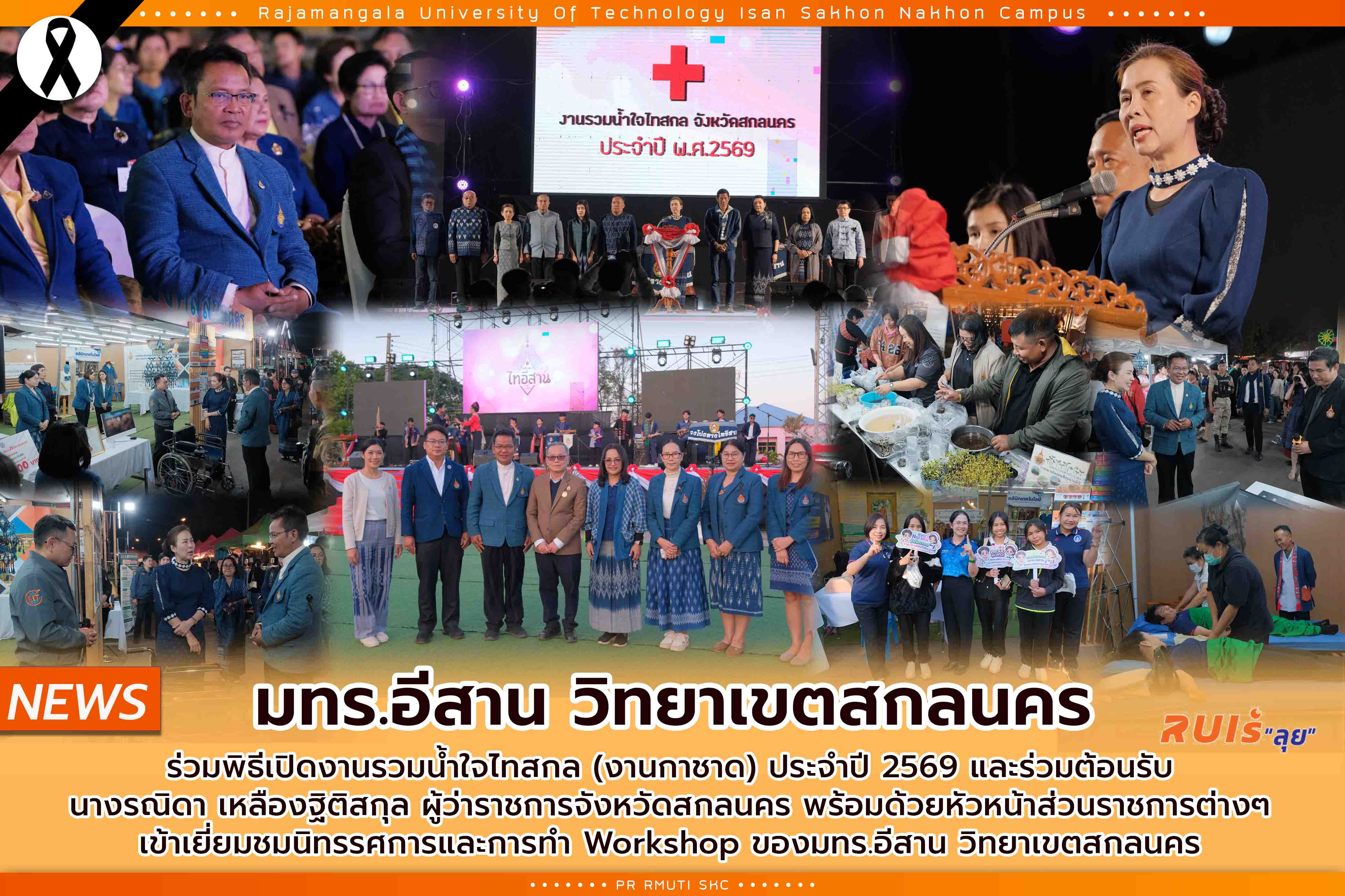 Friday, January 9, 2026, administrators, faculty, staff, and students, Rajamangala University of Technology Isan, Sakon Nakhon Campus, led by Asst. Prof. Dr. Chaweng Saraklong, Vice President of Sakon Nakhon Campus. Participated in the opening ceremony of the Thai Sakon Kindness Festival (Red Cross Fair) for the year 2026 and welcomed Mrs. Ranida Lueangthitisakul. Governor of Sakon Nakhon Province along with heads of various government agencies Visited the exhibition of Rajamangala University of Technology Isan. Sakon Nakhon Campus at the square in front of Sakon Nakhon City Hall (old house). This year, Rajamangala University of Technology Isan, Sakon Nakhon Campus Participated in exhibitions and evening workshops. Including displaying various research results of the Faculty of Natural Resources. Faculty of Industry and Technology Faculty of Nursing Technology Clinic Providing surgical procedures from the staff of Sakon Nakhon Thai Traditional Medicine Hospital, Luang Pu Fab Suphatto, and there are also a variety of activities for visitors to participate in, such as workshops from the Faculty of Industry and Technology. Faculty of Natural Resources and the Faculty of Nursing, including earrings and brooches from naturally dyed cotton, sapling production, Azolla, a magical aquatic plant, fresh flower resin keychains, herbal green oil making, leaf-printed cloth bags, Zero Waste, Happy Animals, Sustainable World, Puppy. Jelly, growing hydroponic vegetables, IE Fast & Efficient : Assembly Race, Sensory Experience, international dinner table setting and napkin folding, "Future Nurse Studio" check your health with a full skin scanner, Mystery of Body activity with interesting anatomy, and Life Saver Hero Challenge activity. Everyone can be a hero if they help revive them. They participated in organizing activities throughout the 10-day event, which was scheduled to take place between 9-18 January 2026 at the Government Center Line, City Hall, Sakon Nakhon Province.