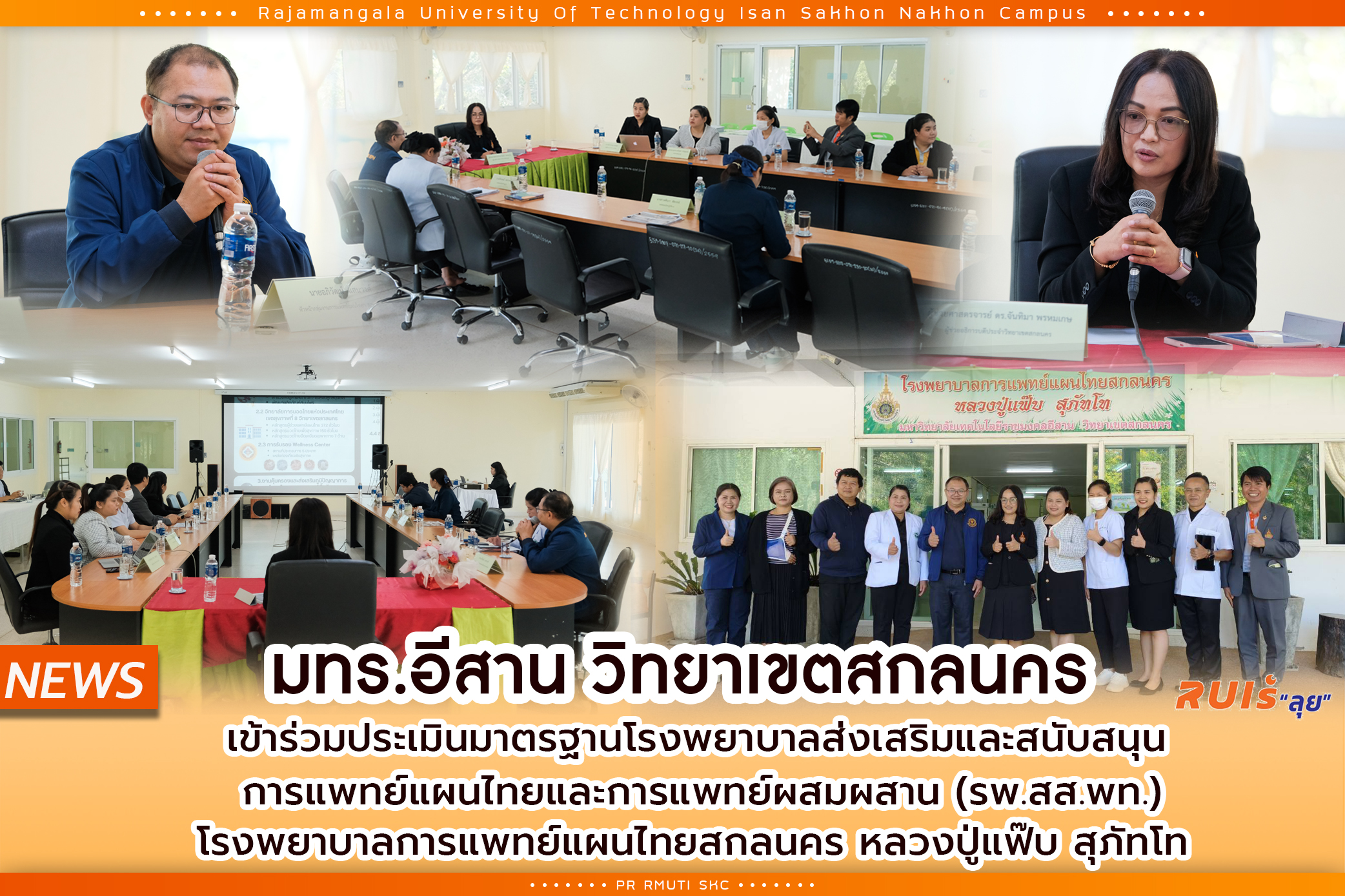 January 15, 2026, Rajamangala University of Technology Isan, Sakon Nakhon Campus, led by Asst. Prof. Dr. Chaweng Saraklong, Vice President of Sakon Nakhon Campus. assigned to Asst. Prof. Dr. Chantima Promkase, Assistant Rector and officials Participated in the standard assessment of hospitals promoting and supporting Thai traditional medicine and integrated medicine (Thai Traditional Medicine Hospital), Sakon Nakhon Thai Traditional Medicine Hospital, Luang Pu Fab Suphatto, by Mr. Apiwat Sangwong, Head of the Thai Traditional and Alternative Medicine Group. Visited the area to assess the standards of the hospital promoting and supporting Thai traditional medicine and integrated medicine (Thai Traditional Medicine Hospital) in order to raise the quality and standard of Thai traditional medicine services in Sakon Nakhon Province. and Mrs. Phetmanee Phonrat, an expert in traditional Thai medicine. Person responsible for standard work at S.S.P.T. Hospital, together with the standard assessment committee from Waritchaphum and Phang Khon districts. Went to the area to inspect and evaluate at Sakon Nakhon Thai Traditional Medicine Hospital, Luang Pu Fab Suphatto. The evaluation covered 5 important areas, including buildings and premises. Tool side Equipment and environment, personnel, operations Quality control and service provision In order to meet the specified standard criteria. In addition, the policy for operating Thai traditional medicine in Sakon Nakhon Province was clarified. Criteria for reimbursement for services according to the National Health Security Office (NHSO) system, including guidelines for promoting the use of herbal medicines in place of modern medicines. To increase health care options for the people appropriately and safely.