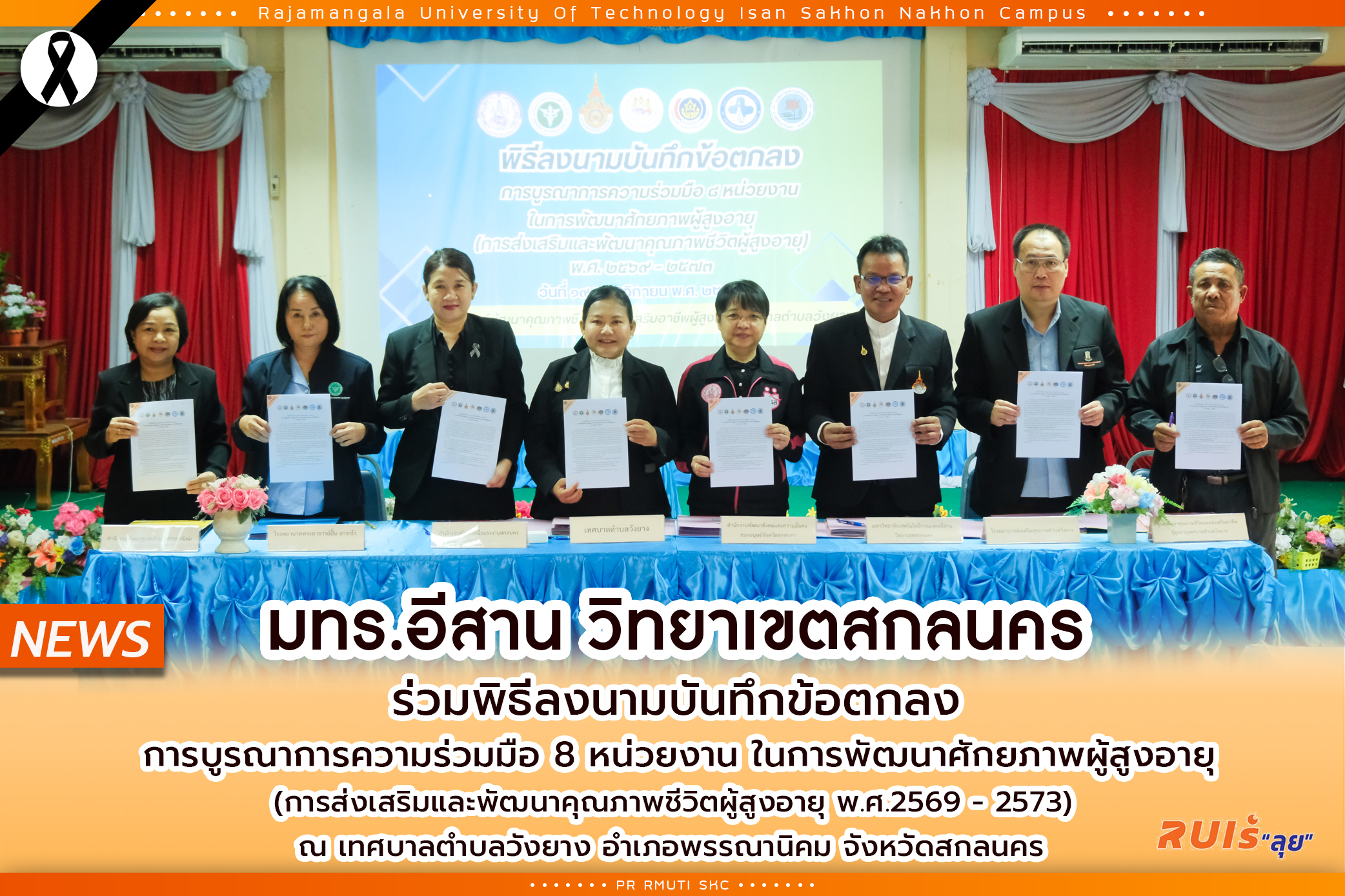 มหาวิทยาลัยเทคโนโลยีราชมงคลอีสาน วิทยาเขตสกลนคร เข้าร่วมบันทึกข้อตกลงความร่วมมือ (MoU) การบูรณาการพัฒนาศักยภาพผู้สูงอายุ ระหว่าง 8 หน่วยงาน วันที่ 19 พฤศจิกายน 2568 ณ เทศบาลตำบลวังยาง อำเภอพรรณานิคม จังหวัดสกลนคร ผู้ช่วยศาสตราจารย์ ดร.ชเวง สารคล่อง รองอธิการบดีประจำวิทยาเขตสกลนคร มหาวิทยาลัยเทคโนโลยีราชมงคลอีสาน ได้เข้าร่วมพิธีลงนามบันทึกข้อตกลงความร่วมมือ (MoU) โครงการบูรณาการพัฒนาศักยภาพผู้สูงอายุ “แผนการส่งเสริมและพัฒนาคุณภาพชีวิตผู้สูงอายุ พ.ศ. 2569 – 2573” ร่วมกับอีก 7 หน่วยงานสำคัญ เพื่อยกระดับคุณภาพชีวิตผู้สูงอายุในพื้นที่ตำบลวังยางอย่างรอบด้าน จากสถานการณ์ปัจจุบัน พบว่าจำนวนผู้สูงอายุในเทศบาลตำบลวังยางเพิ่มขึ้นอย่างต่อเนื่อง โดยในปีงบประมาณ 2568 มีสัดส่วนผู้สูงอายุคิดเป็นร้อยละ 22.5 ของประชากรทั้งหมด ส่งผลให้พื้นที่ก้าวเข้าสู่ “สังคมผู้สูงอายุสมบูรณ์” ประชากรกลุ่มนี้เป็นทรัพยากรที่มีคุณค่า มีประสบการณ์และความรู้ แต่มีข้อจำกัดด้านสุขภาพและความสามารถในการดำรงชีวิต เทศบาลตำบลวังยางจึงได้ริเริ่มบันทึกข้อตกลงบูรณาการร่วม 8 หน่วยงาน เพื่อร่วมกันสนับสนุนการพัฒนาศักยภาพผู้สูงอายุให้มีคุณภาพชีวิตที่ดีขึ้น ไม่เป็นภาระแก่ครอบครัวและสังคม พร้อมส่งเสริมให้ผู้สูงอายุสามารถดำรงชีวิตอย่างมีศักดิ dignity และมีบทบาทในชุมชนอย่างยั่งยืน บันทึกข้อตกลงครั้งนี้ประกอบด้วย 8 หน่วยงานที่มีภารกิจเฉพาะด้านในการดูแลผู้สูงอายุ ดังนี้ 1. สำนักงานพัฒนาสังคมและความมั่นคงของมนุษย์จังหวัดสกลนคร ดูแลผู้สูงอายุตามพระราชบัญญัติผู้สูงอายุ พ.ศ. 2546 และที่แก้ไขเพิ่มเติม พ.ศ. 2553 2. โรงพยาบาลพระอาจารย์ฝั่น อาจาโร ดูแลสุขภาพผู้สูงอายุในชุมชนอย่างใกล้ชิด 3. มหาวิทยาลัยเทคโนโลยีราชมงคลอีสาน วิทยาเขตสกลนคร ส่งเสริมการเรียนรู้ตลอดชีวิต การถ่ายทอดองค์ความรู้ และการวิจัยด้านสุขภาพผู้สูงอายุ 4. สำนักงานพัฒนาฝีมือแรงงานสกลนคร ส่งเสริมอาชีพและพัฒนาทักษะฝีมือให้ผู้สูงอายุสามารถประกอบอาชีพได้ 5. สำนักงานพัฒนาชุมชนอำเภอพรรณานิคม สนับสนุนการพัฒนาผลิตภัณฑ์และช่องทางจำหน่ายสินค้าโดยผู้สูงอายุ 6. โรงพยาบาลส่งเสริมสุขภาพตำบลบ้านวังยาง ดูแลสุขภาพผู้สูงอายุในระดับปฐมภูมิ 7. ศูนย์พัฒนาคุณภาพชีวิตและส่งเสริมอาชีพผู้สูงอายุ เทศบาลตำบลวังยาง จัดกลุ่มเป้าหมายและขับเคลื่อนการพัฒนาคุณภาพชีวิตผู้สูงอายุเบื้องต้น 8. เทศบาลตำบลวังยาง ส่งเสริมคุณภาพชีวิตผู้สูงอายุในทุกมิติทั้งด้านสุขภาพ สังคม และอาชีพ การลงนาม MoU ครั้งนี้เป็นจุดเริ่มต้นสำ