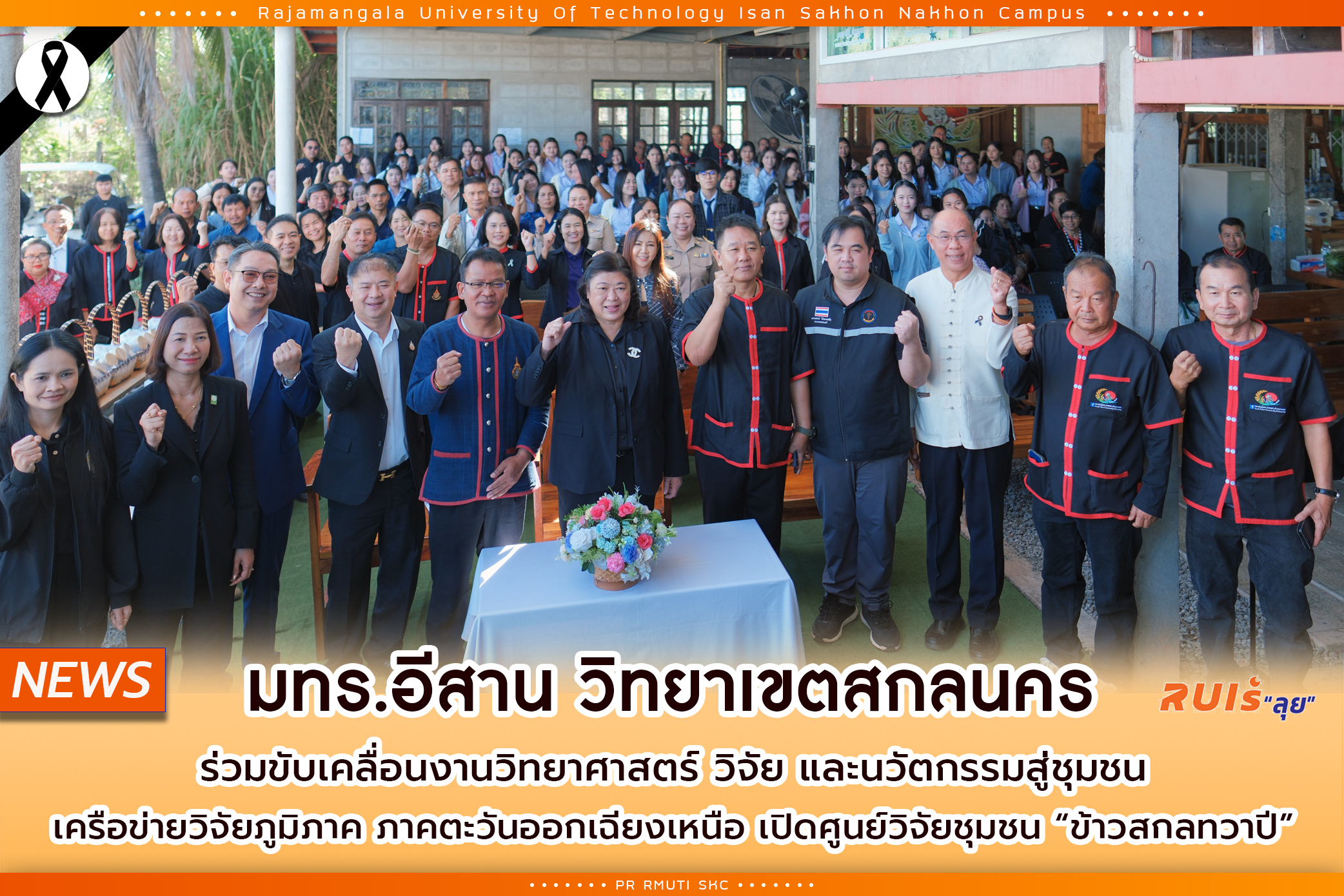 วันที่ 24 พฤศจิกายน 2568 มหาวิทยาลัยเทคโนโลยีราชมงคลอีสาน วิทยาเขตสกลนคร นำโดย ผู้ช่วยศาสตราจารย์ น.สพ.ดร.ชเวง สารคล่อง รองอธิการบดีประจำวิทยาเขตสกลนคร พร้อมด้วยผู้บริหาร คณาจารย์ และเจ้าหน้าที่ ร่วมพิธีเปิดศูนย์วิจัยชุมชน “ข้าวสกลทวาปี” ภายใต้โครงการบริหารจัดการเครือข่ายวิจัยภูมิภาค: ภาคตะวันออกเฉียงเหนือ โดยได้รับเกียรติจาก ดร.วิภารัตน์ ดีอ่อง ผู้อำนวยการสำนักงานการวิจัยแห่งชาติ (วช.) เป็นประธานในพิธี โดยมี ศาสตราจารย์ไชยยงค์ นาวานุเคราะห์ หัวหน้าโครงการและรองประธานเครือข่ายวิจัยภูมิภาค กล่าวถึงวัตถุประสงค์ของการจัดตั้งศูนย์วิจัยชุมชน พร้อมด้วย นายวิชาญ ดาทุมมา นายอำเภอพังโคน กล่าวต้อนรับและแสดงความร่วมมือของพื้นที่ในการสนับสนุนศูนย์แห่งนี้ การเปิดศูนย์ฯ ในครั้งนี้นับเป็นอีกก้าวสำคัญของการนำงานวิจัยและนวัตกรรมลงสู่พื้นที่อย่างเป็นรูปธรรม เพื่อเสริมสร้างคุณภาพชีวิตของประชาชน ต่อยอดภูมิปัญญาท้องถิ่น และสร้างผลลัพธ์เชิงชุมชนที่ยั่งยืน สำนักงานการวิจัยแห่งชาติ (วช.) ได้มอบหมายให้ เครือข่ายวิจัยภูมิภาค ภาคตะวันออกเฉียงเหนือ มหาวิทยาลัยขอนแก่น ดำเนินการจัดตั้งศูนย์วิจัยชุมชนทั่วภูมิภาค เพื่อเป็นกลไกสำคัญในการถ่ายทอดผลงานวิจัยที่ใช้งานได้จริง ตอบโจทย์ปัญหาในพื้นที่ พัฒนาทักษะด้านเทคโนโลยี และสร้างบุคลากรท้องถิ่นให้เป็นผู้เชี่ยวชาญและวิทยากรด้านต่าง ๆ ปัจจุบันเครือข่ายฯ จัดตั้งศูนย์แล้วทั้งสิ้น 15 ศูนย์ ครอบคลุมด้านหัตถกรรม เกษตรกรรม นวัตกรรมอาหาร การท่องเที่ยว และการเกษตรสมัยใหม่ สำหรับ ศูนย์วิจัยชุมชน “ข้าวสกลทวาปี” เป็นศูนย์ลำดับที่ 16 ตั้งอยู่ในพื้นที่จังหวัดสกลนคร ซึ่งมีศักยภาพโดดเด่นด้านการผลิตข้าวคุณภาพสูงและภูมิปัญญาท้องถิ่นด้านการแปรรูปข้าวมายาวนาน เหมาะสมต่อการพัฒนาเป็นแหล่งเรียนรู้ด้านการผลิตข้าวครบวงจร เพื่อเพิ่มคุณภาพผลผลิตและสร้างความมั่นคงทางเศรษฐกิจให้กับชุมชนในพื้นที่ โดยมทร.อีสาน วิทยาเขตสกลนครได้นำองค์ความรู้ด้านวิทยาศาสตร์ วิจัย และนวัตกรรม มาสนับสนุนศูนย์แห่งนี้ในหลายมิติ อาทิ 1.พัฒนากระบวนการผลิตข้าวด้วยเทคโนโลยีที่เหมาะสม 2.ยกระดับมาตรฐานผลิตภัณฑ์ชุมชน เช่น ข้าวฮาง ข้าวพรีเมียม และผลิตภัณฑ์แปรรูป 3.ใช้นวัตกรรมและเทคโนโลยีเพิ่มมูลค่าผลิตภัณฑ์ชุมชน 4.ถ่ายทอดองค์ความรู้ให้เกษตรกรและผู้ประกอบการท้องถิ่น 5.พัฒนาบุคลากรชุมชนให้เป็นนักวิจัยและวิทยากรในอนาคต การเปิด ศูนย์วิจัยชุมชน “ข้าวสกลทวาปี” จึงเป็นหมุดหมายสำคัญของการบูรณาการ “วิจ