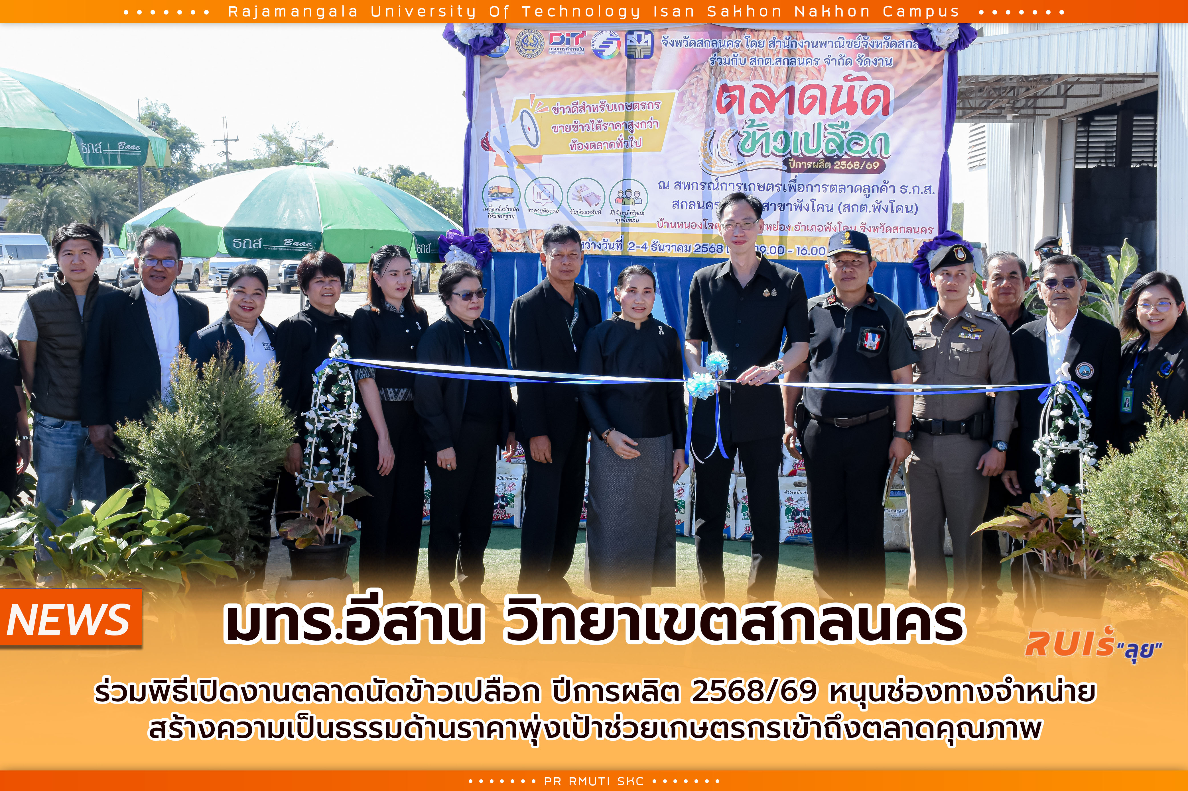 วันที่ 2 ธันวาคม 2568 มหาวิทยาลัยเทคโนโลยีราชมงคลอีสาน วิทยาเขตสกลนคร นำโดย ผู้ช่วยศาสตราจารย์ น.สพ.ดร.ชเวง สารคล่อง รองอธิการบดีประจำวิทยาเขตสกลนคร ร่วมพิธีเปิดงานตลาดนัดข้าวเปลือก ปีการผลิต 2568/69 หนุนช่องทางจำหน่าย–สร้างความเป็นธรรมด้านราคา พุ่งเป้าช่วยเกษตรกรเข้าถึงตลาดคุณภาพ โดยได้รับเกียรติจาก นายปริญ นิทัศน์เอก รองผู้ว่าราชการจังหวัดสกลนคร เป็นประธานในพิธีฯ โดยมี นางลักขณา บุญนำ พาณิชย์จังหวัดสกลนคร กล่าวต้อนรับประธานในพิธี พร้อมชี้แจงวัตถุประสงค์ของโครงการในครั้งนี้ พร้อมกันนี้ นายวิชาญ ดาทุมมา นายอำเภอพังโคน หัวหน้าส่วนราชการ ผู้แทนสหกรณ์การเกษตร ภาคเอกชน และเกษตรกรในพื้นที่ ได้ร่วมเป็นเกียรติในพิธีเปิดงานดังกล่าว ณ สหกรณ์การเกษตรเพื่อการตลาดลูกค้า ธ.ก.ส. สกลนคร จำกัด สาขาพังโคน (สกต.พังโคน) ตำบลไฮหย่อง อำเภอพังโคน จังหวัดสกลนคร