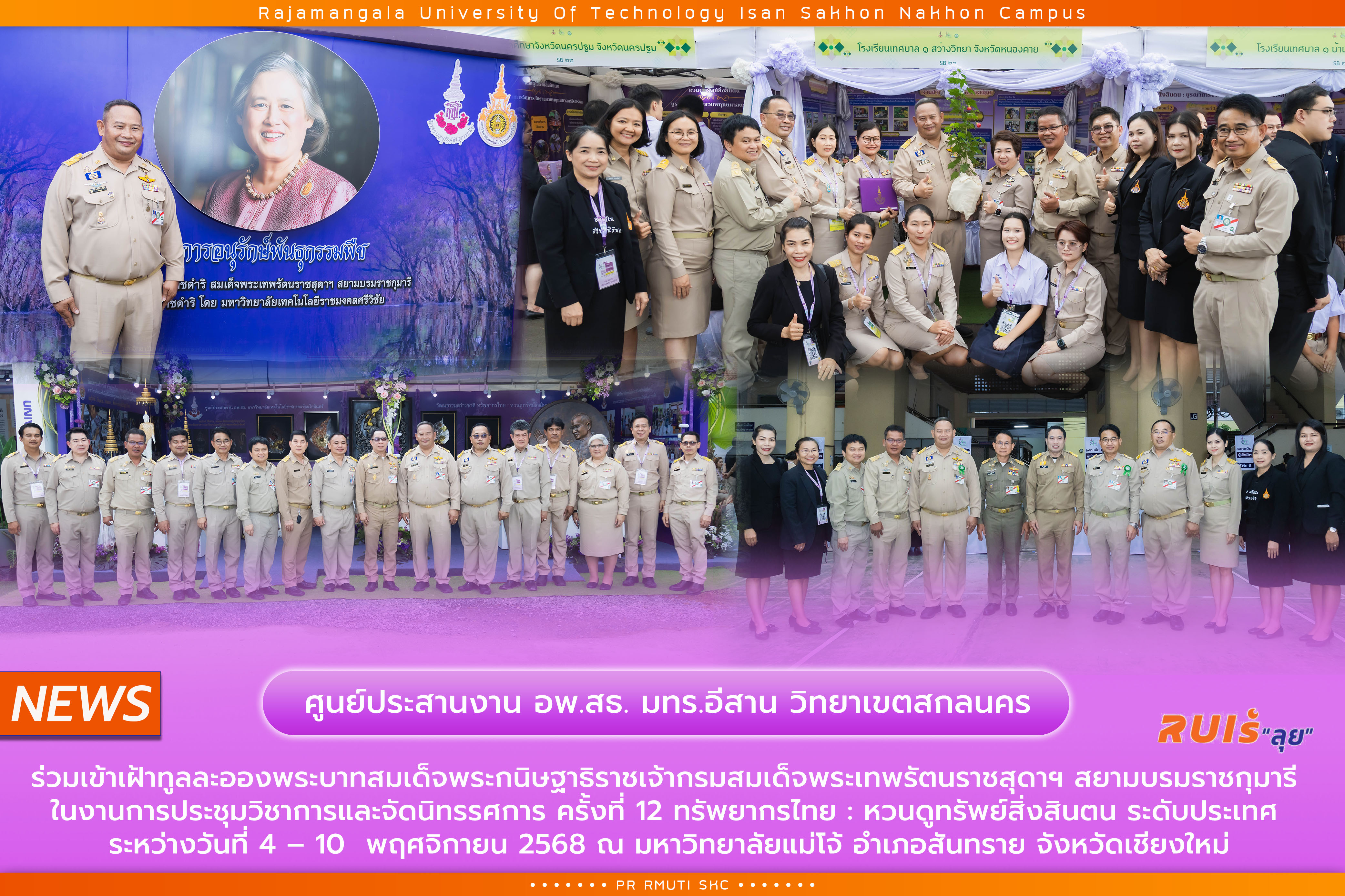 coordination center The Ministry of Public Health - Rajamangala University of Technology Isan Sakon Nakhon Campus Participate in an audience with Her Royal Highness Princess Maha Chakri Sirindhorn. Princess Maha Chakri Sirindhorn At the 12th academic conference and exhibition, Thai Resources: Looking back at assets at the national level, between 4 - 10 November 2025 at Maejo University, San Sai District, Chiang Mai Province, led by Associate Professor Dr. Kosit Sriputhon, President of Rajamangala University of Technology Isan. Assistant Professor Dr. Chaweng Saraklong, Vice President of Sakon Nakhon Campus along with the executive team and the coordination center operating committee The Ministry of Public Health - Rajamangala University of Technology Isan Sakon Nakhon Campus To honor His Majesty Continuing the royal wishes Create understanding and appreciation of the importance of resources available in Thailand. The work was brought to participate in an exhibition in collaboration with Rajamangala University of Technology Isan. Nakhon Ratchasima Province Ready to collect the work of Lecturer Inthat Sribut, Lecturer Sayam Prachudthasri Topic: “Carbon credit assessment” Work information: Mao: Collection of species and their use by Asst. Prof. Dr. Suchitra, specific work information: Indigo: Create sustainability: Create added value with waste materials in the natural indigo dyeing process. Values created by nature but humans must preserve. Organized a Work Shop activity to screen bags using leftover dyes from indigo dyeing and natural dyes to create beautiful patterns by Professor Dr. Wassana Khawthita and tribal brochures from Sakon Nakhon Province by Asst. Prof. Kanokkarn Wichasin. Along with this, Professor Inthat Sribut and Professor Panisara Prachudthasri joined as MCs for the school's botanical garden academic conference, presented by administrators. Teachers and lecturers at the Chaloem Phrakiat Sports Center At the 12th Academic Conference and Exhibition, Thai Resources: Looking Back at Assets, this time there were members of the school's botanical garden. Participating in 4 places: 1. Triam Udom Suksa School Northeast Sakon Nakhon Province (ก.1) 2. Ban Phon Sa Community School Nong Khai Province (K.1) 3. Ratchaprachanukroh School 27, Nong Khai Province (K.2) 4. Thesaban 1 School, Sawang Witthaya, Nong Khai Province (sign level) also participated in the exhibition this time.