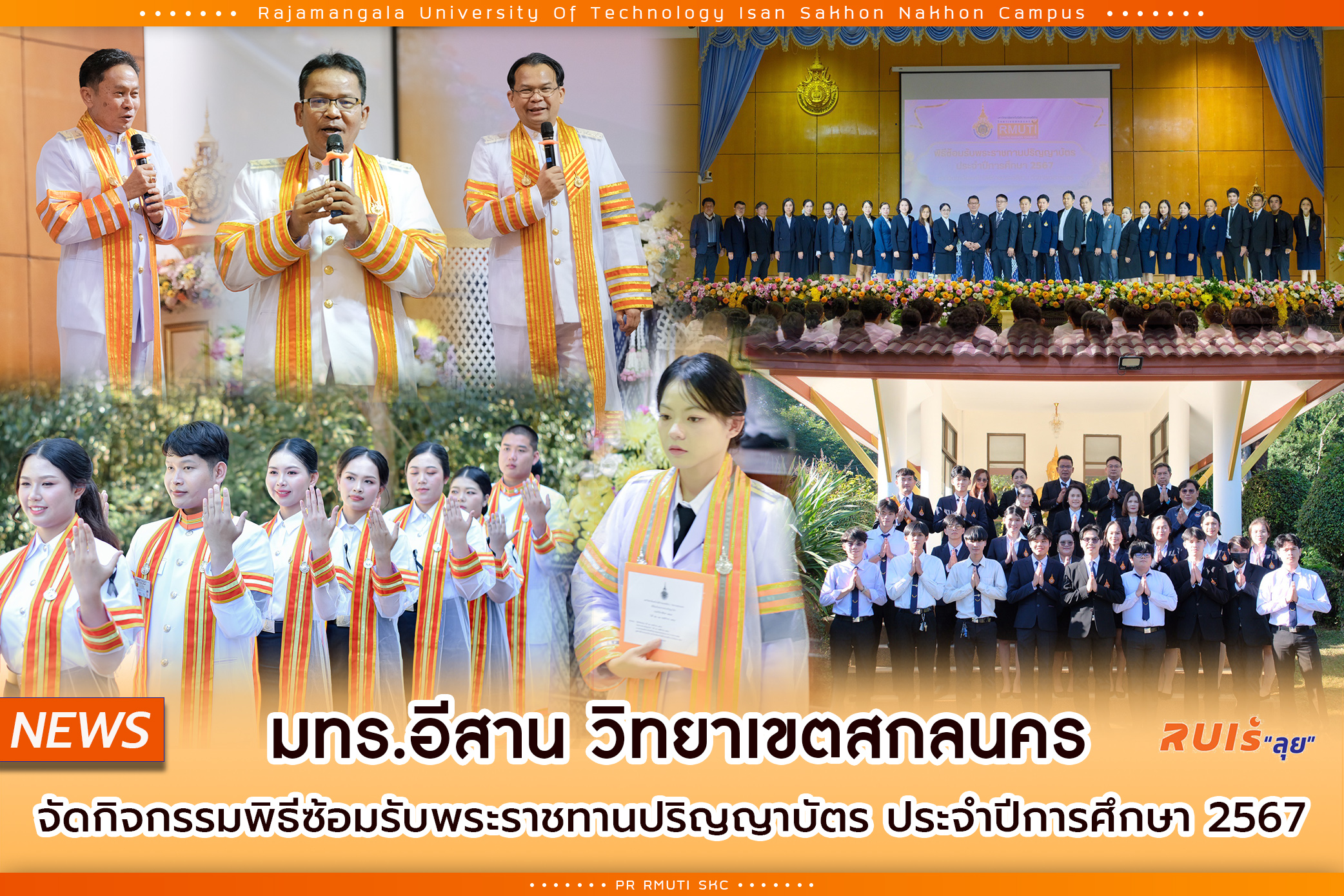 Rajamangala University of Technology Isan, Sakon Nakhon Campus Organize a rehearsal activity for the Royal Graduation Ceremony Academic year 2024, with Assistant Professor Dr. Chaweng Saraklong, Vice President of Sakon Nakhon Campus. Assistant Professor Dr. Pichet Wechawithan, Dean of the Faculty of Natural Resources Assistant Professor Dr. Suriya Kaewasa, Dean of the Faculty of Industry and Technology Participated in giving a sermon and congratulating new graduates at Khamkoon Meeting Room 6, Academic Resources and Information Technology Building. A mini-practice ceremony was held between 22 - 23 November 2025. On the morning of 22 November 2025, there was a ceremony to pay homage to the shrine for good fortune. and on the occasion of organizing a small rehearsal ceremony for graduates who will receive their royal degrees. The training atmosphere was smooth. In addition to the mini-practice, there was also a group photo of the graduates and a photo session to congratulate the graduates. This year, there were many people who came to congratulate the graduates, full of smiles of happiness.